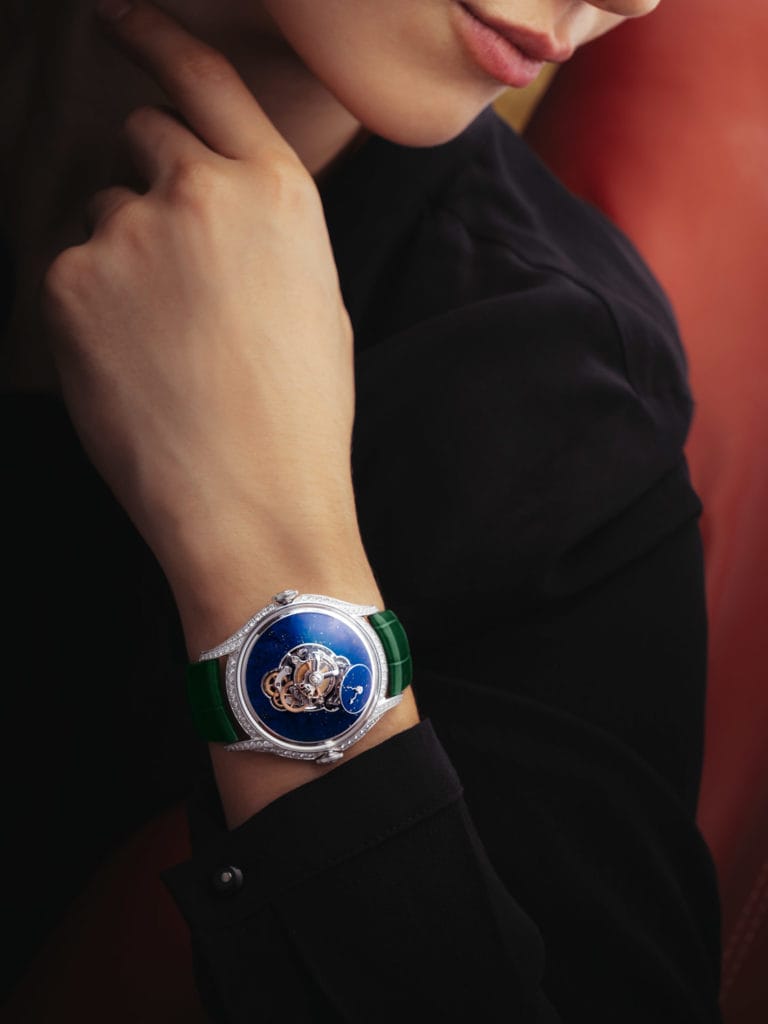 Un boîtier rond en or ou en platine, avec une lunette fortement cambrée et de fines attaches étirées souvent entièrement serties de diamants. Un dôme en verre saphir extrêmement bombé s’élève loin au-dessus de la lunette. En dessous, un cadran légèrement incurvé se pare de différentes finitions : laque tendue d’un noir profond, guilloché, lapis lazuli scintillant, ou diamants blancs d’un éclat éblouissant.