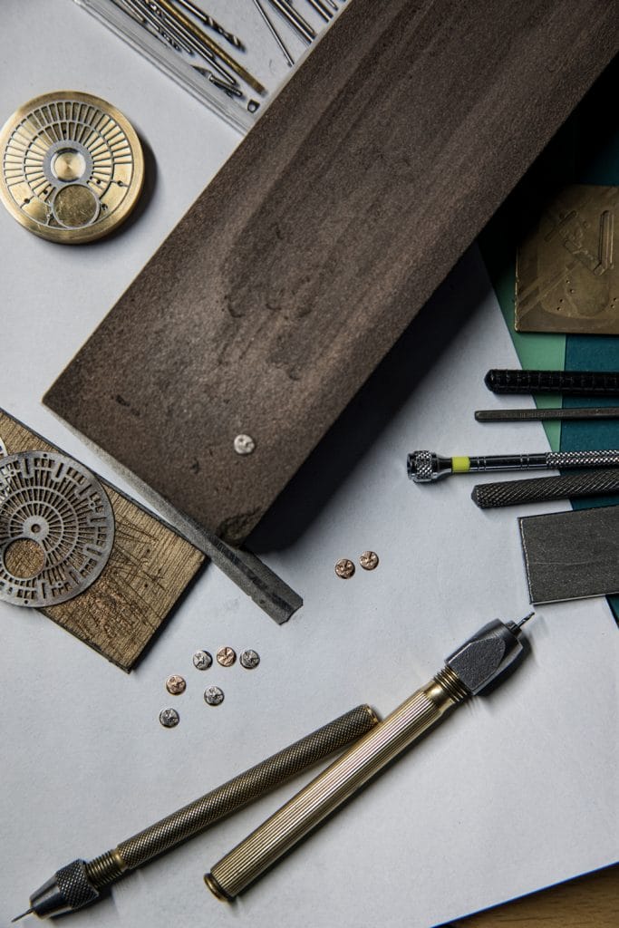Les lunes de 4,5 mm de diamètre atteignent l’extrême limite de ce qui est réalisable à la main — en dessous, les traits de la face ne seraient plus clairement visibles. Ils sont par ailleurs difficilement perceptibles au toucher, même du bout des doigts experts de Stepan Sarpaneva et de son équipe. Les dimensions confinant à l’impossible répondent aux contraintes du boîtier et aux tolérances imposées par l’emplacement : les lunes devaient se loger au-dessous du prisme optique en préservant suffisamment d’espace pour les disques des heures et des minutes.