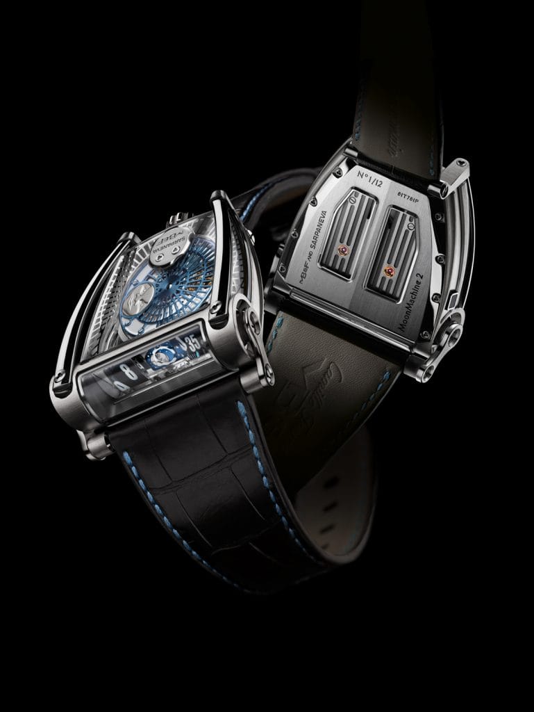 La MOONMACHINE 2 est une HM8 à configuration singulière : la projection lunaire est une complication imaginée, conçue et réalisée par Stepan Sarpaneva. La création est disponible en trois séries limitées à 12 exemplaires.