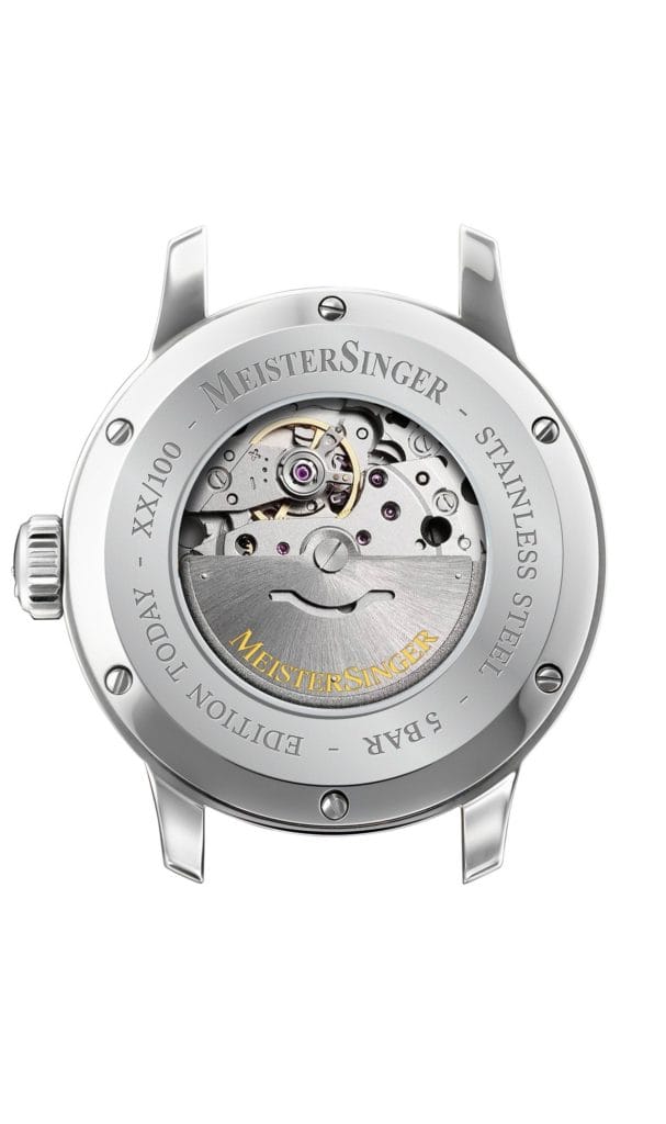 Bénéficiant d’une réserve de marche de 42 heures, l’Urban Day Date « Edition Today » embarque un mouvement mécanique à remontage automatique de facture japonaise (Miyota), laissant admirer ses rouages, dont le rotor gravé du logo MeisterSinger, par un fond de boîte transparent.