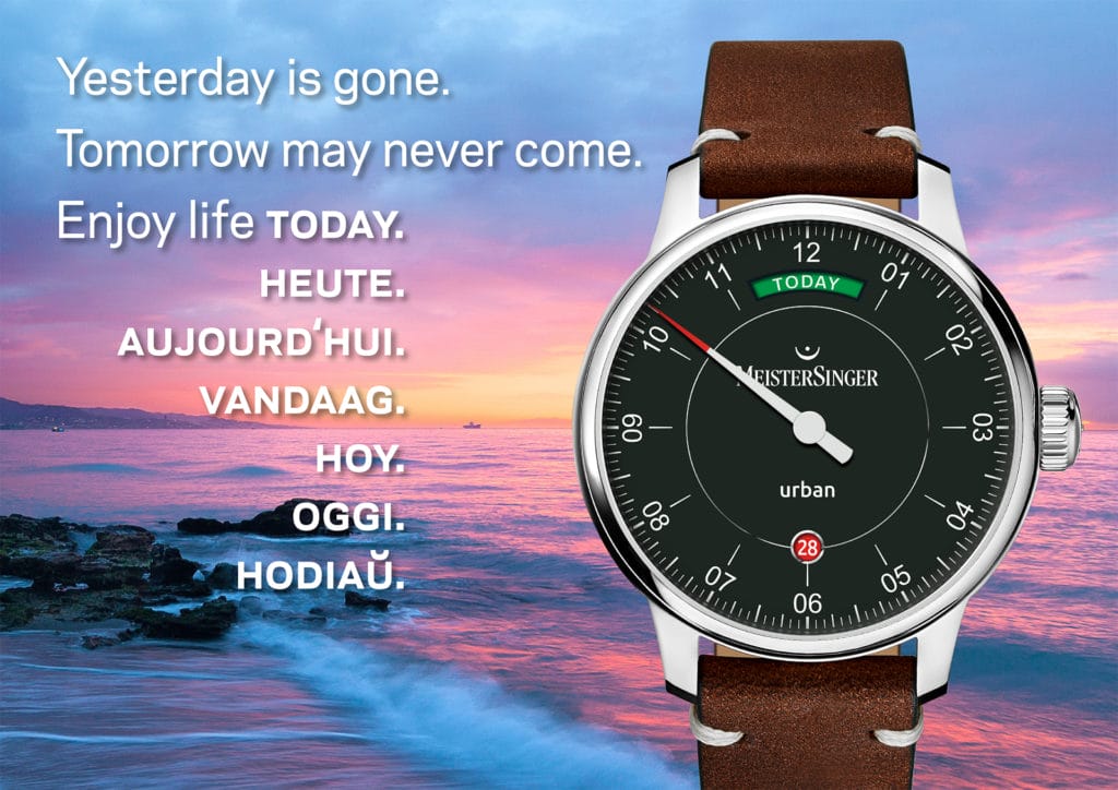 La marque horlogère allemande MeisterSinger dévoile une nouvelle série limitée, baptisée Urban Day Date « Edition Today ». Edité à 100 exemplaires (dont 10 pour la France), ce garde-temps se singularise par un affichage du jour, unique en son genre : les jours de la semaine sont remplacés par le mot « aujourd’hui », écrit en sept langues différentes. Une jolie façon de rappeler que rien n’est plus important que le moment présent.