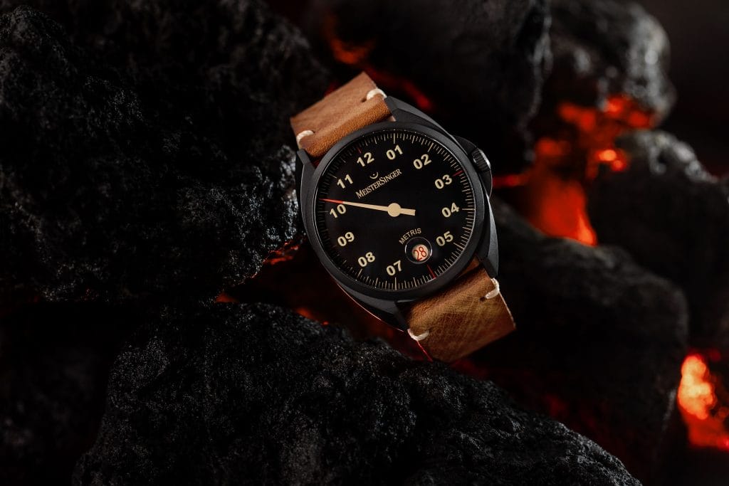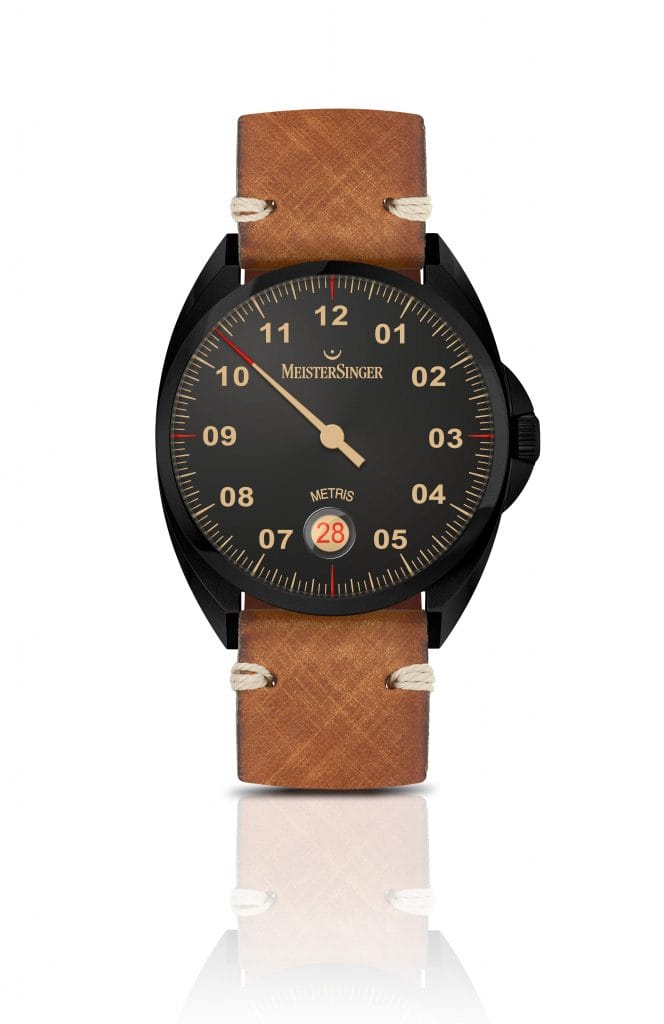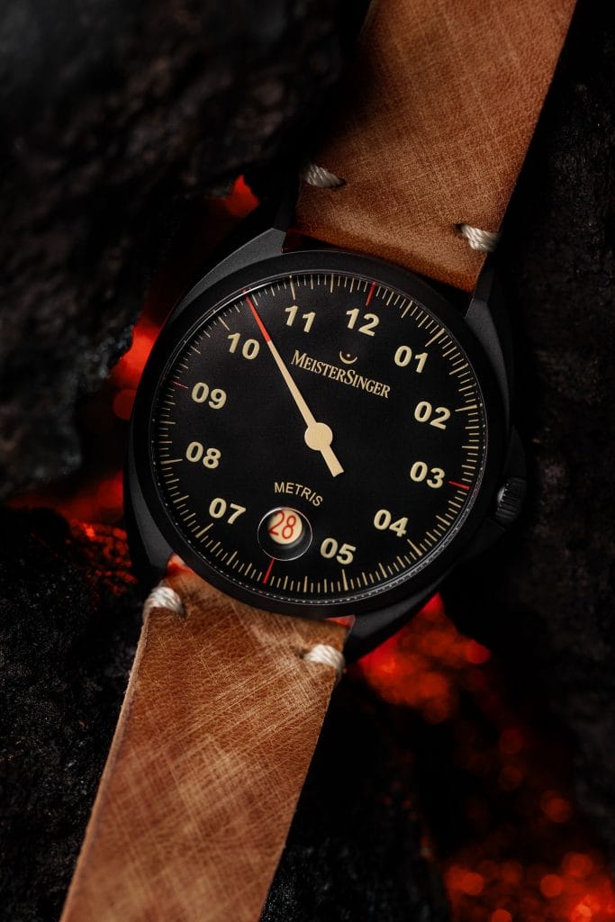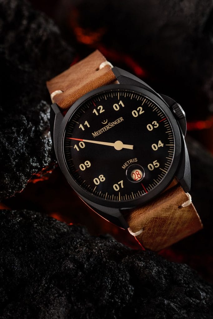 Montre tout-terrain lancée en 2018 par MeisterSinger, la Metris se singularise du reste de la collection par le caractère robuste de son boîtier (38 mm de diamètre) antichoc et étanche jusqu’à 200 mètres de profondeur. Dégageant une certaine similarité avec les modèles sportifs des années 70, cette pièce horlogère présente une carrure solide aux flancs incurvés ainsi que des cornes distinctives, le tout mis en relief par une couronne vissée. Aujourd’hui, son boîtier en acier a été intégralement revêtu de DLC (Diamond-Like Carbon). Présentant une extrême dureté et une parfaite résistance aux rayures, en raison de ses propriétés proches de celles du diamant, celui-ci a été sablé pour donner une finition mate.