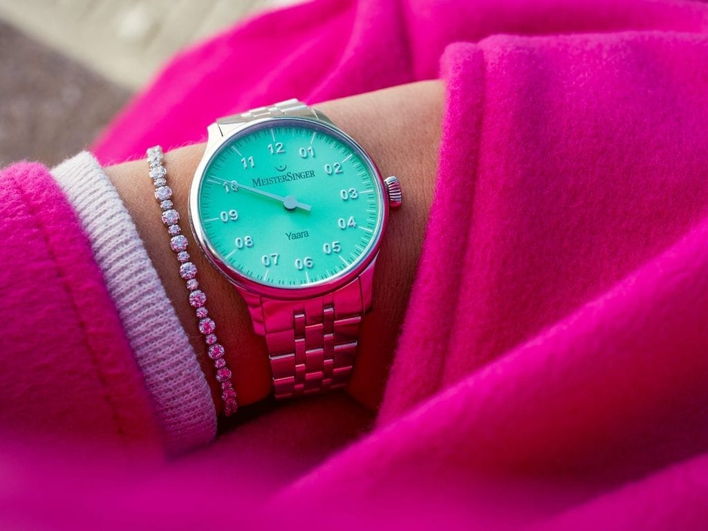 MeisterSinger présente trois versions colorées aux surfaces chatoyantes dans un boîtier en acier inoxydable : bleu glacier, saumon et menthe.
