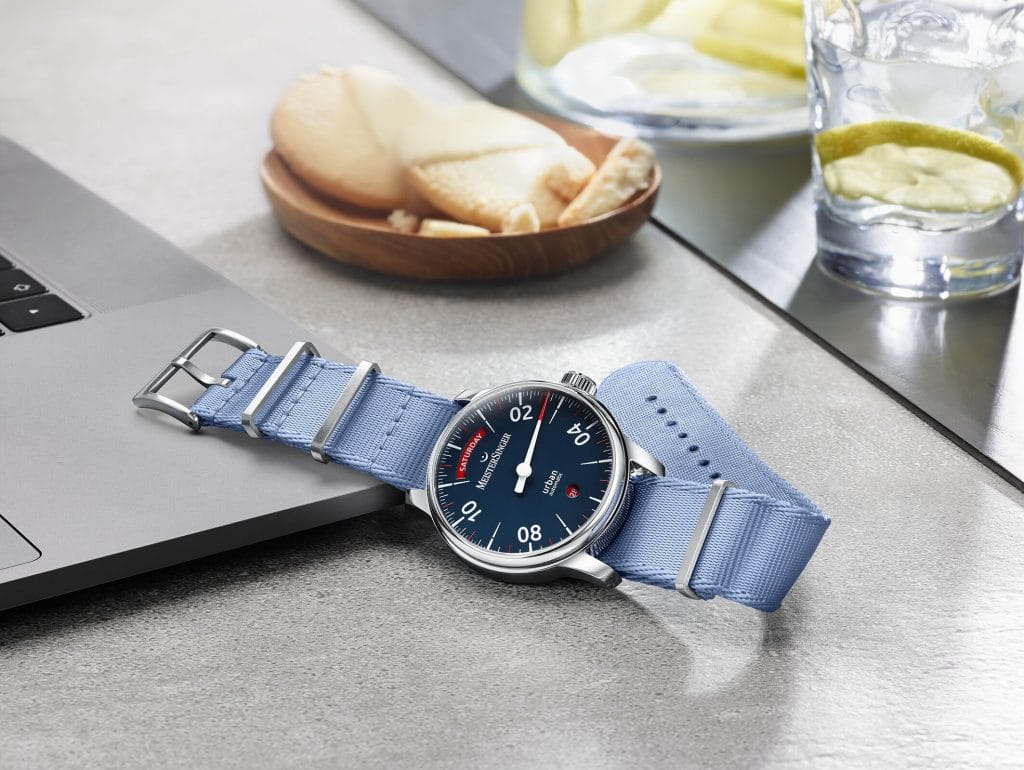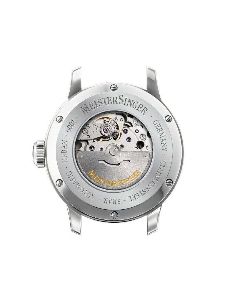 Bénéficiant d’une réserve de marche de 42 heures, l’Urban Day Date bat au rythme d’un mouvement mécanique à remontage automatique de facture japonaise (Miyota), laissant admirer ses rouages, dont le rotor gravé du logo MeisterSinger, par le fond de boîte transparent. Si son propriétaire doit quitter la montre le temps d’un week-end, le jour et la date peuvent être réajustés rapidement grâce à la couronne. Un détail qui séduira tout un chacun.