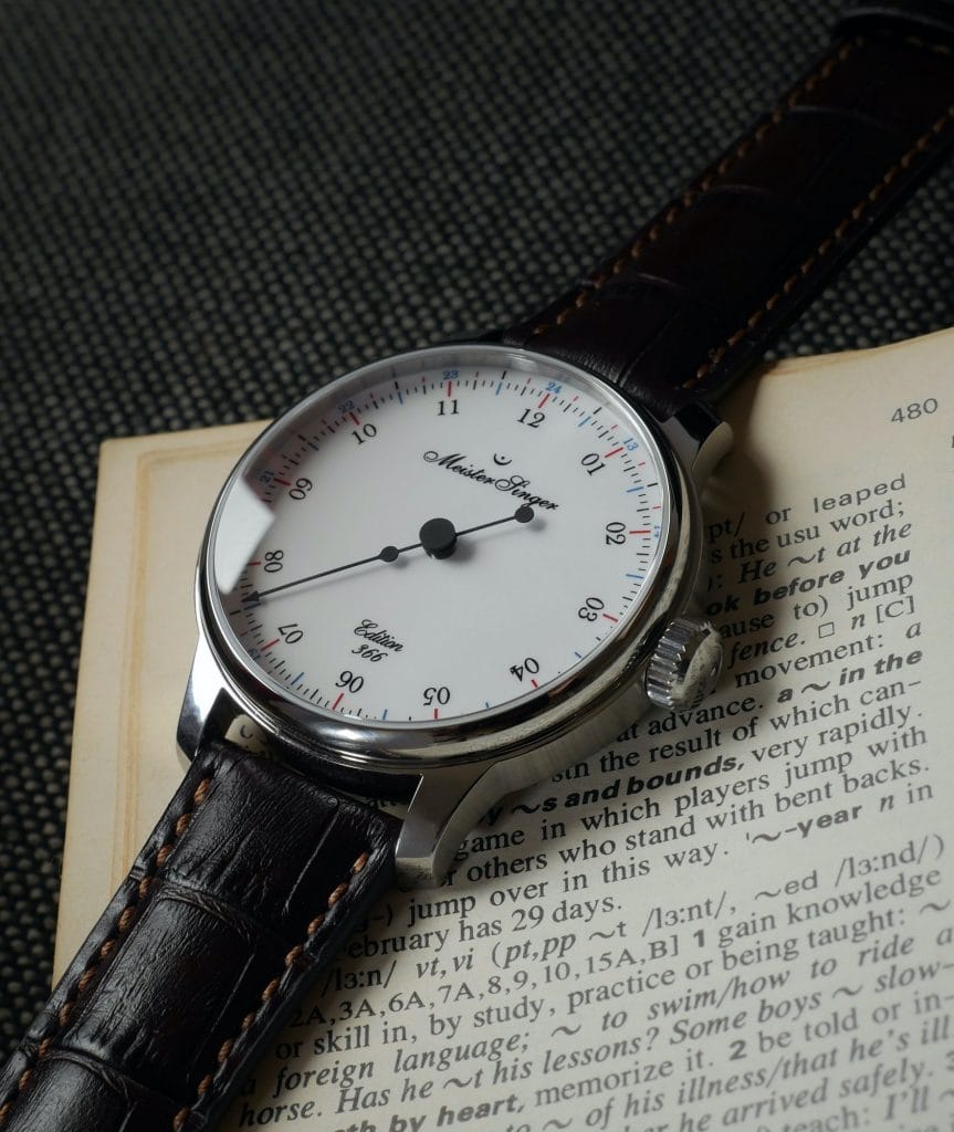 Minutieusement subdivisée, l’échelle des minutes, codée en trois couleurs pour plus de clarté, est également une première chez MeisterSinger. Alors que chaque intervalle de cinq minutes est indiqué par un marqueur noir, les heures pleines et les quarts d’heure sont signalés en rouge, les demi-heures sont signifiées en bleu.