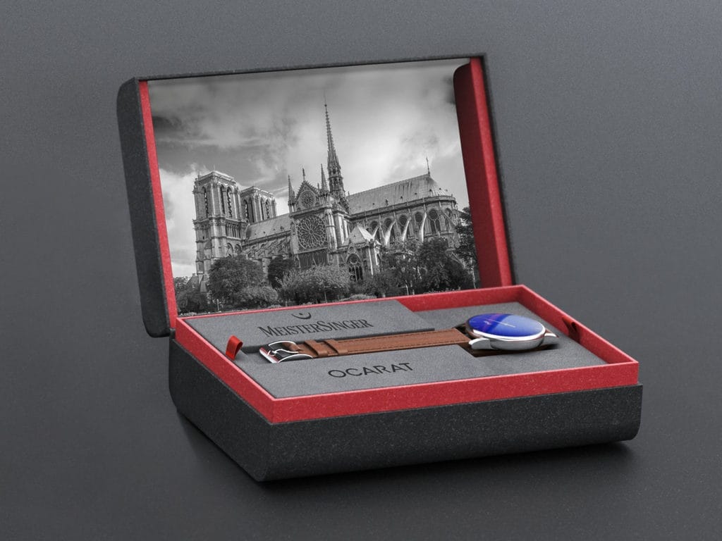 L’Edition Notre-Dame est sublimée par un bracelet en cuir de vachette de haute qualité, soigneusement tanné à l’écorce de chêne et teinté à la main. Chaque montre est présentée dans un coffret spécial, orné d’une photo représentant la cathédrale Notre-Dame de Paris. Limité à seulement 70 exemplaires, ce modèle exclusif est disponible pour les membres du Club MeisterSinger et peut être acquis directement sur le site de vente en ligne Ocarat ou chez Ochrono à Paris, à l’exception de 20 pièces réservées pour les membres du club.