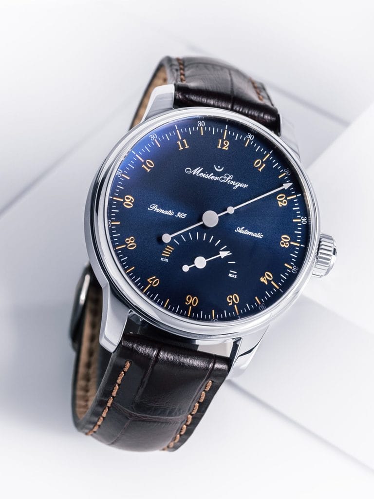 Respectant l’ADN de MeisterSinger, la grande aiguille indique l’heure sur un cadran divisé en 144 segments de cinq minutes. À 6 heures, une petite aiguille affiche la réserve de marche, fonctionnant comme une jauge : lorsque l’indicateur atteint la gauche, un remontage manuel via la couronne est nécessaire, sauf si la montre est portée quotidiennement. Contrairement au modèle initial de 2022, cette version délaisse le guichet de date pour un style épuré.