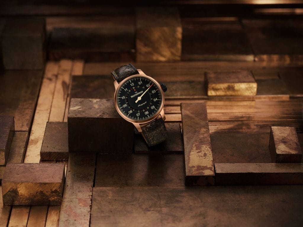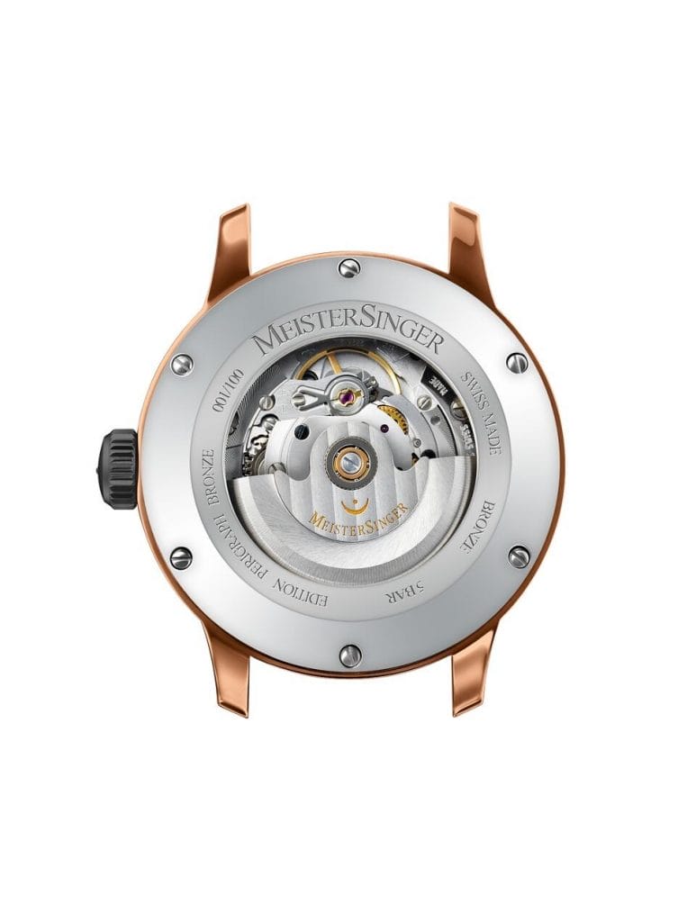Singulier par son métal, le boîtier tout en bronze de cette MeisterSinger se patinera avec le temps, évoluant au contact de la peau, des éléments, de la lumière. Alliage de cuivre et d’étain, il arbore initialement une teinte proche de l’or rose ou de l’or rouge pour évoluer du vert-de-gris à l’ardoise en passant par toutes les étapes intermédiaires. En effet, la surface du bronze s’oxydant, une “patine” naturelle se forme, protégeant le métal sous-jacent de toute corrosion. D’où, un aspect unique acquis au fil des ans, propre à chaque montre : plus elle vieillit, plus elle se bonifie. Anticipant ce processus, la marque horlogère a donc choisi d’habiller cette Perigraph d’un bracelet en cuir vieilli, finalisé d’un fermoir en DLC noir.
