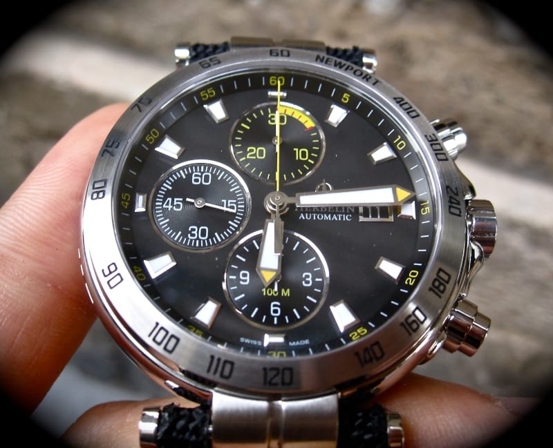 Cette montre est un chronographe automatique. Le choix des couleurs présentes sur cette montre est le fruit d’un travail spécifique dont le résultat est tout à la fois moderne et intemporel grâce au noir et aux différentes touches de jaune sur différents éléments de la montre : les aiguilles, le compteur des minutes (les cinq premières minutes), et les surpiqures sur le bracelet toile dont le résultat est intéressant.