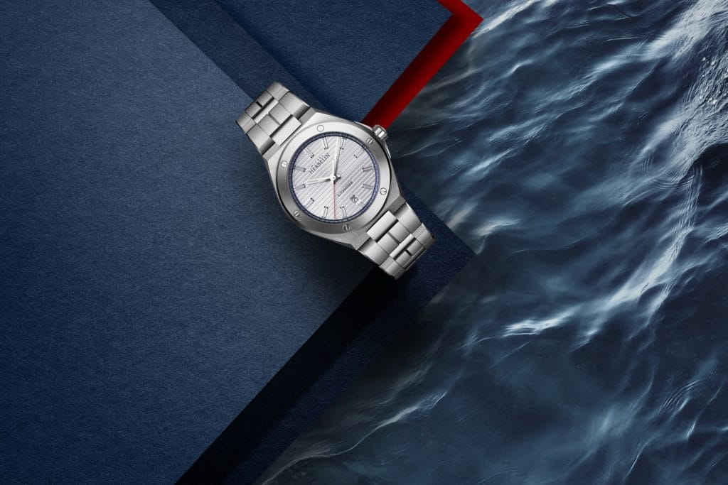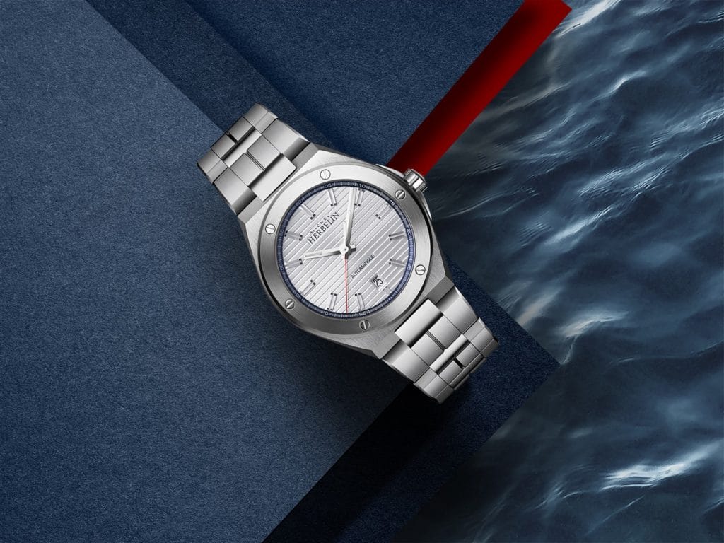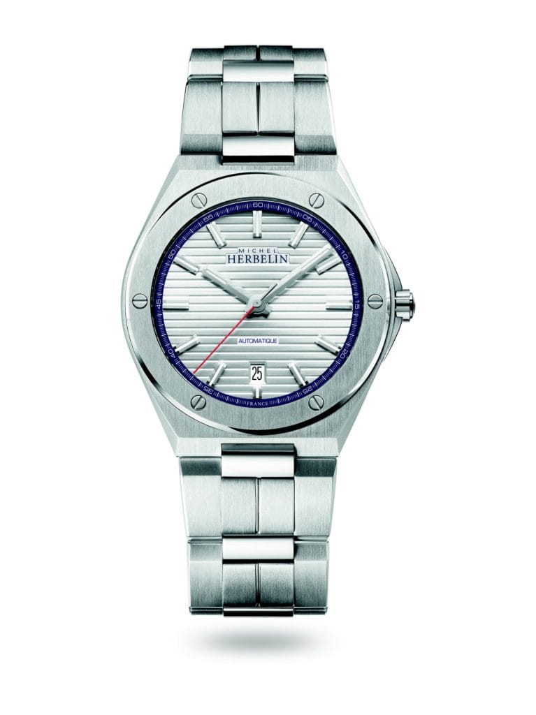 A l’heure de la France par son code couleur, cette Cap Camarat reste néanmoins fidèle à l’esthétique de la collection, inspirée d’une pièce des années 1970 du patrimoine horloger de Michel Herbelin. Ancrée dans la mouvance du design horloger de cette époque, la maison interprète, elle aussi, à sa façon, le concept de montre « sport chic ». Défini par un boîtier à vis apparentes et aux angles saillants équipé d’un bracelet intégré, il est devenu un classique de ces années où apparaît un mode de vie plus décontracté.