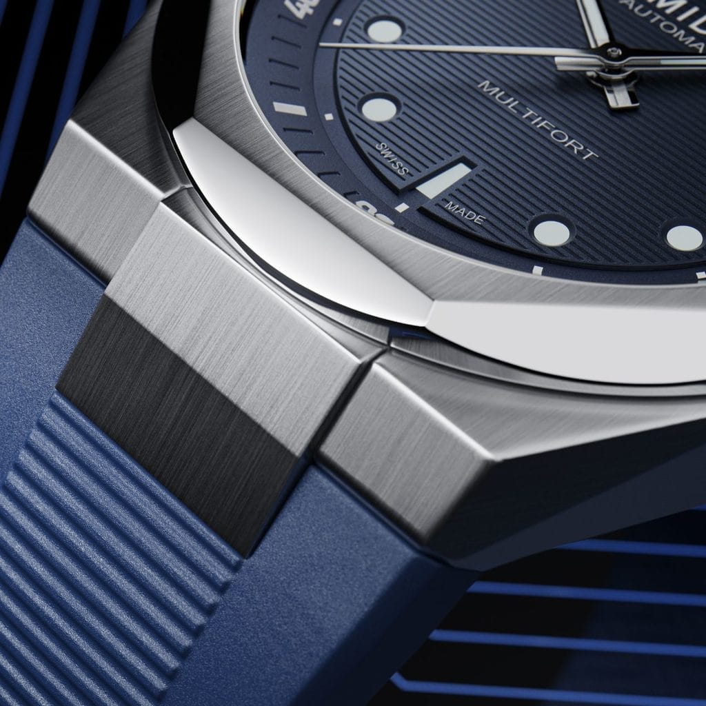 Mais c’est la lunette de la Multifort 8 Two Crowns qui révèle véritablement sa particularité. D’une grande finesse d’exécution, elle ose cette fois huit facettes polies, contrastées par du satinage. L’éclat de l’acier inoxydable se prolonge sur l’entier de la boîte. Sur les flancs, les deux couronnes traitées avec du PVD bleu appuient la teinte profonde du cadran. L’harmonie de couleurs se poursuit avec le bracelet en caoutchouc bleu, travaillé avec des reliefs au centre pour créer des reflets, parfait pour passer de la ville au grand air.