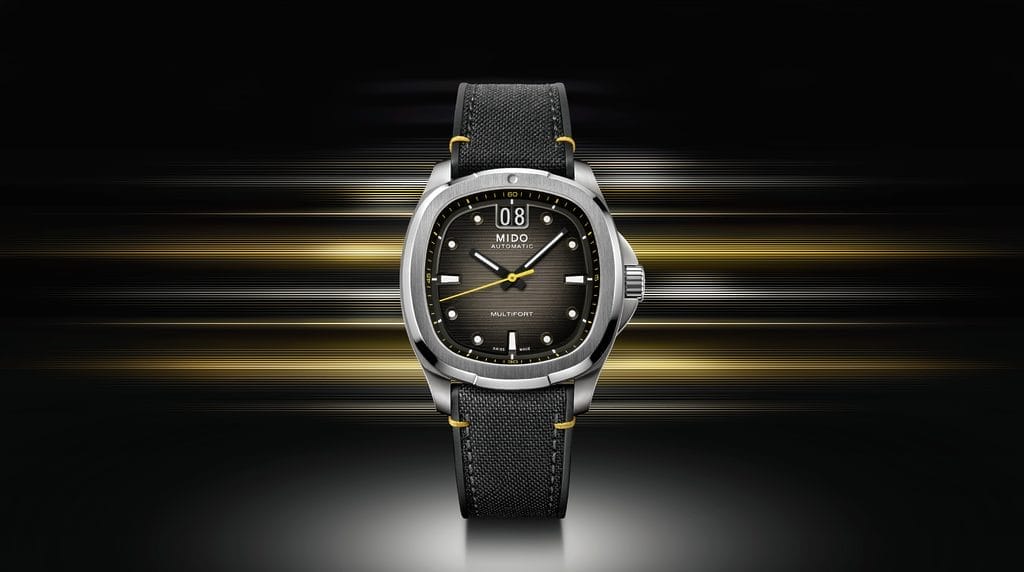 MIDO présente une nouvelle version de sa Multifort TV Big Date, en acier, avec un cadran dégradé du noir vers le gris, rehaussé par des touches de jaune dynamique. Sous son boîtier aux lignes rétro, le mouvement Calibre 80 assure une précision remarquable. Ce modèle au style affirmé, accompagné d’un bracelet textile noir, se distingue avec subtilité.