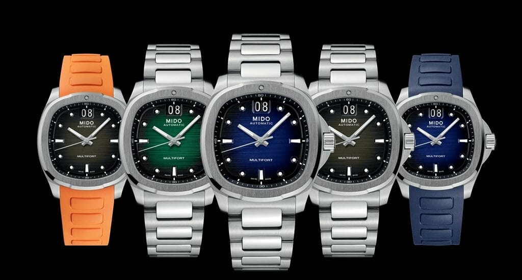 Quatre autres modèles accompagnent ce lancement de collection en version acier au cadran dégradé vert et une autre au cadran dégradé noir, ainsi que deux autres versions avec des bracelets caoutchouc bleu marine pour l’une et d’un orange, très caractéristique de Mido, pour l’autre.