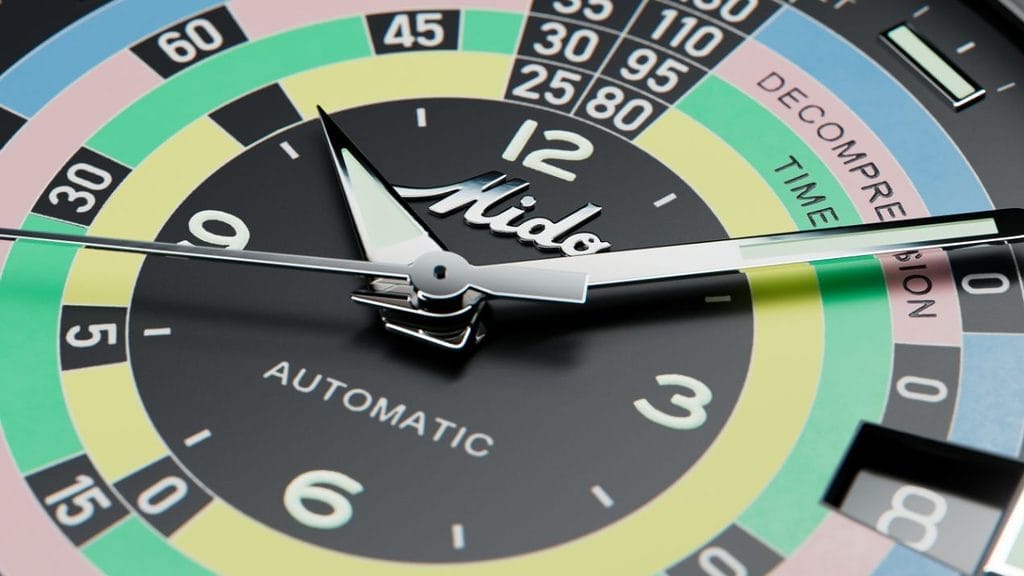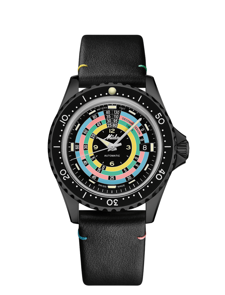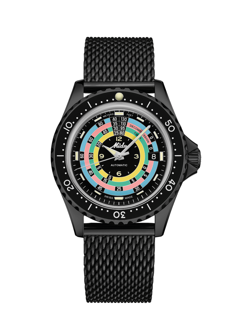 Cadran Noir mat avec index en applique polis garnis de Super-LumiNova® blanc, date à 3 heures. Logo MIDO original en applique polie. Échelle de décompression représentée par 4 cercles de couleurs (jaune, vert, rose, bleu).