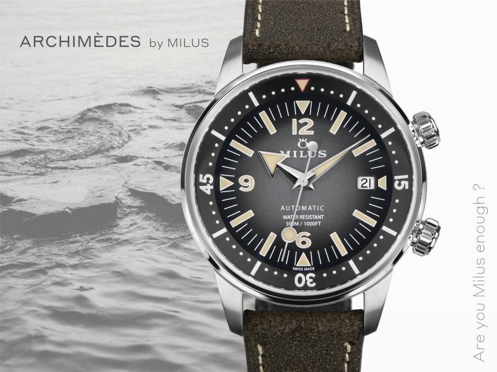 Autre modèle de la collection Iconic, l’Archimedes dont les origines remontent aux années 60, avec le modèle 666, et aux années 70 avec la Super Compressor équipés des fameux boîtiers étanches Ervin Picquerez.