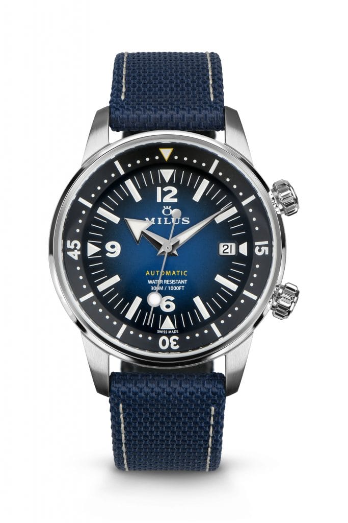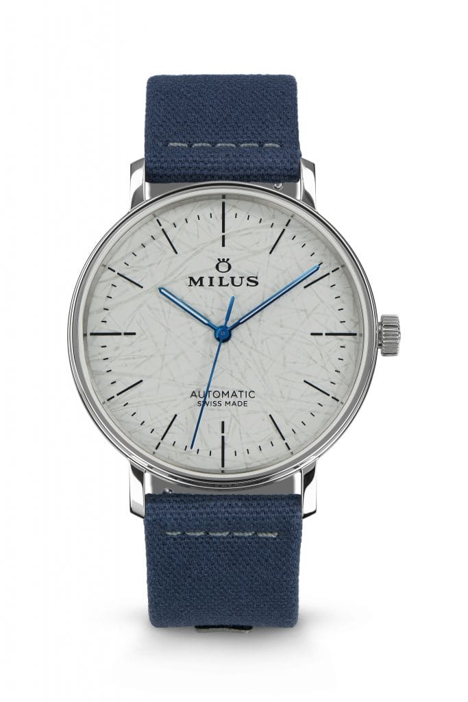Avec sa nouvelle collection LAB, Milus entend s’inspirer librement de ses designs des années 90, grande époque de minimalisme stylistique et de design. Très graphique, elle arbore un cadran vraiment original en fibres de verre apparentes qui donnent son unicité à chaque pièce. Gris clair, gris foncé ou bleu, surmonté d’aiguilles traitées Superluminova, ce cadran protégé par un verre saphir traité antireflets intérieur est parfaitement mis en valeur par un boîtier d’acier de 40 mm, étanche à 5 ATM, simple, épuré, aux finitions polies et brossées. Le fond de boîte en verre saphir laisse apparaître la finition soleil du rotor et du cercle d’emboitage. La LAB 01 est équipée d’un mouvement automatique Sellita disposant de 38h de réserve de marche. Elle est montée sur un bracelet en coton naturel doublure cuir. Son prix: 990.- CHF.