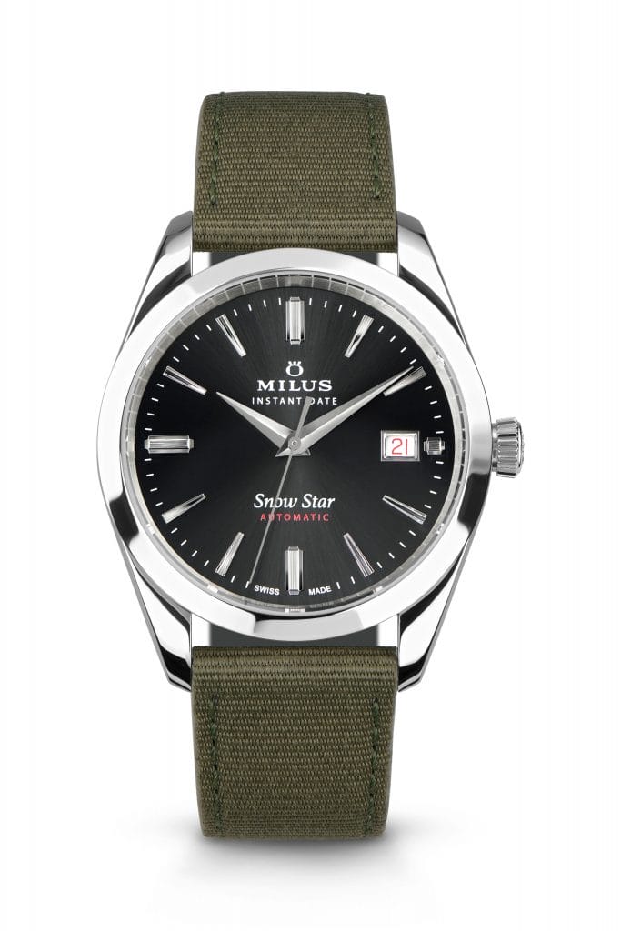 C’est quasiment la même Snow Star que l’on retrouve aujourd’hui. Robuste, avec son harmonieuse carrure oblongue en acier 904 L poli miroir (39 mm de diamètre) des cadrans noirs ou argent brossé soleil, des aiguilles Dauphine, des index appliques posés main et un quantième dateur rouge vif positionné à 3 heures, la nouvelle Snow Star reprend tous les éléments identitaires de son ancêtre des années 40. Montée sur bracelet textile doublé cuir, elle est équipée d’un mouvement automatique ETA 2892. Son prix : 1’690.- CHF.