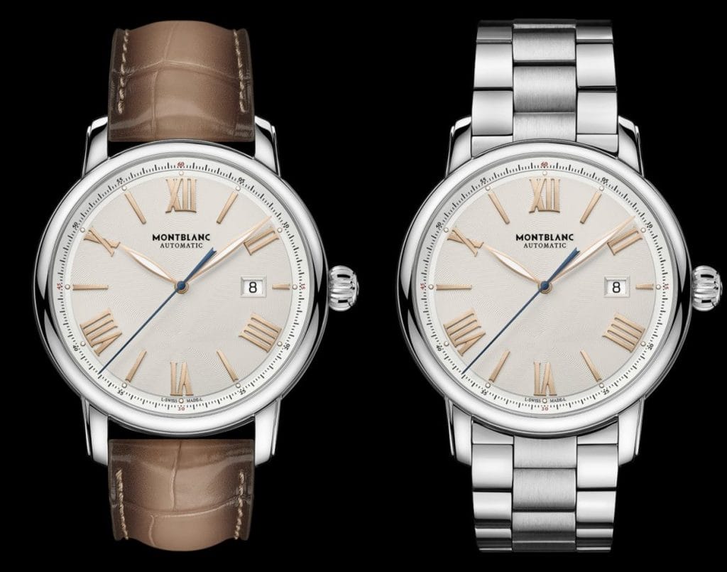 La nouvelle montre Montblanc Star Legacy Automatic Date est logée dans un boîtier en acier inoxydable de 43 mm complété par un verre saphir traité antireflet et un fond également en verre saphir. Le cadran est proposé en deux versions : l’un ivoire avec rehaut blanc argenté et chiffres romains, index et aiguilles dorés à l’or rose 18K, l’autre anthracite avec chiffres romains, index et aiguilles rhodiés noirs. Les deux modèles sont rehaussés de SuperLuminova* pour une lisibilité optimale dans l’obscurité.