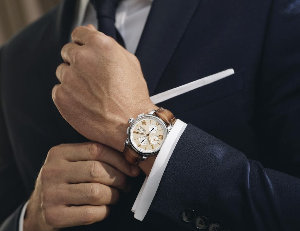 Le cadran est proposé en deux couleurs : l’un en ivoire avec rehaut et compteurs blanc argenté, chiffres romains, index et aiguilles dorés à l’or rose 18 K pour les indications horaires, et aiguilles bleuies pour les indications du chronographe ; l’autre en anthracite avec chiffres romains, index et aiguilles rhodiés noirs et revêtus de SuperLuminova* pour une meilleure lisibilité de nuit. Étanches à 50 mètres, les montres se ferment par un bracelet Sfumato marron ou gris. Elles sont également disponibles avec un bracelet 3 rangs en acier inoxydable alternant des finitions polies et satinées.