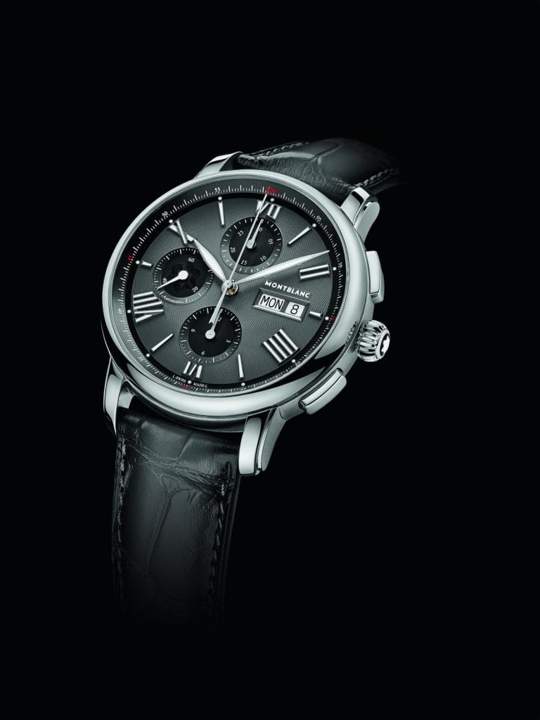 La nouvelle montre Montblanc Star Legacy Chronograph Day&Date se présente dans un boîtier en acier inoxydable de 43 mm avec verre saphir bombé. Le fond est également en verre saphir pour permettre au propriétaire de la montre d’admirer le mouvement chronographe automatique MB25.07 qu’il protège. Le mouvement chronographe MB25.07 dispose d’une réserve de marche de 48 heures et indique les secondes écoulées à l’aide d’une aiguille de chronographe centrale, les minutes écoulées sur un compteur 30 minutes, et les heures écoulées sur un compteur 12 heures. Les affichages du jour et de la date se trouvent dans des guichets à trois heures.