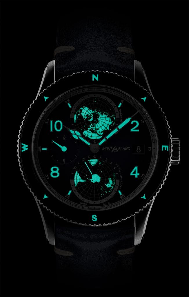Pour une lisibilité optimale, l’indicateur jour/nuit, les aiguilles cathédrales, les index, les points cardinaux et les globes rotatifs des hémisphères nord et sud sont tous revêtus de Super-LumiNova® blanc appliqué à la main.