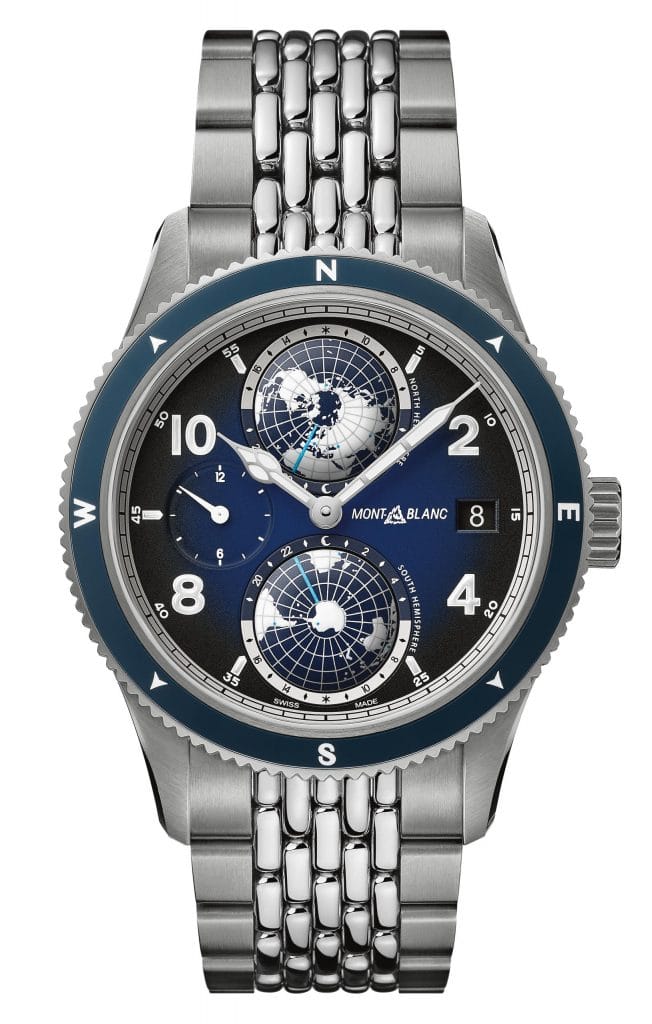 La montre Montblanc 1858 Geosphere fait partie des modèles les plus emblématiques de la ligne 1858, avec ses deux globes rotatifs correspondant aux hémisphères nord et sud et sa complication heures universelles. Cette année, Montblanc présente la montre 1858 Geosphere en titane grade 5 de couleur bleue avec détails blancs givrés en contraste, évoquant les glaciers et les sommets enneigés dont la gamme chromatique peut aller du blanc le plus immaculé au bleu le plus profond. Autant d’éléments qui contribuent à créer un look contemporain. Le ton bleu givré est le résultat de millions d’années de pression exercées par les bulles d’air sous la glace, la lumière ne reflétant ainsi que le bleu du spectre des couleurs.