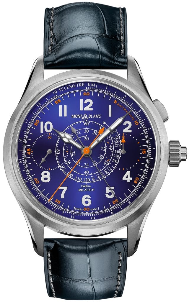Le tachymètre est associé à une complication « rattrapante » sophistiquée, conçue par les ingénieurs Montblanc pour mesurer des temps intermédiaires sans interrompre la mesure d’intervalles plus longs. L’aiguille rattrapante peut être admirée à travers le fond en verre saphir, à l’instar des montres classiques dotées de cette fonction. Pour une meilleure lisibilité, les indications du chronographe s’affichent via une aiguille centrale du chronographe beige accompagnée d’une piste de même couleur, tandis que l’aiguille rattrapante est de couleur orange avec une piste assortie. Le compteur des minutes du chronographe est placé à 3 heures.