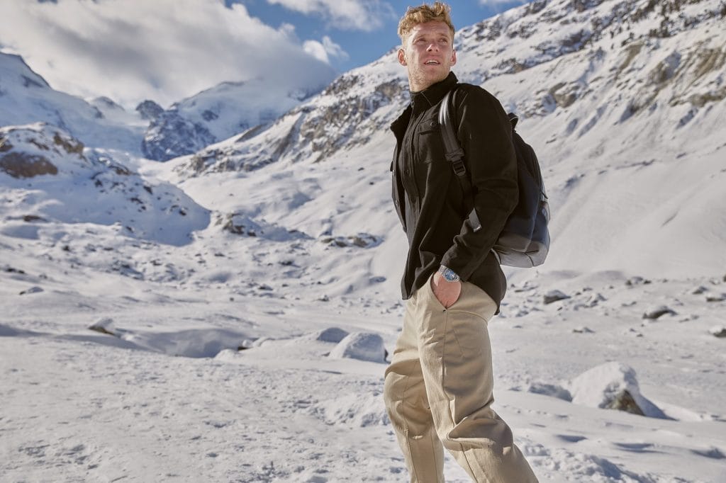 La Montblanc 1858 Geosphere s’insère dans un boîtier de 42 mm en titane, matériau robuste et durable qui résiste aux rayures superficielles. Sa faible conductivité thermique et sa légèreté garantissent un confort optimal au poignet. Ce matériau high-tech à la robe sombre incarne à la perfection l’esprit de l’alpinisme. Le boîtier se compose d’une lunette bidirectionnelle crantée en acier inoxydable, rehaussée de céramique bleue brillante et gravée de quatre points cardinaux luminescents. Le cadran se présente dans une robe bleu fumé associée à des éléments blanc givré, qui lui confèrent un look moderne venu tout droit du grand froid. En outre, la montre inclut tous les codes de design caractéristiques de la collection 1858, à savoir les index et chiffres arabes, l’authentique logo Montblanc des années 1930, les aiguilles cathédrales bombées et la minuterie chemin de fer.