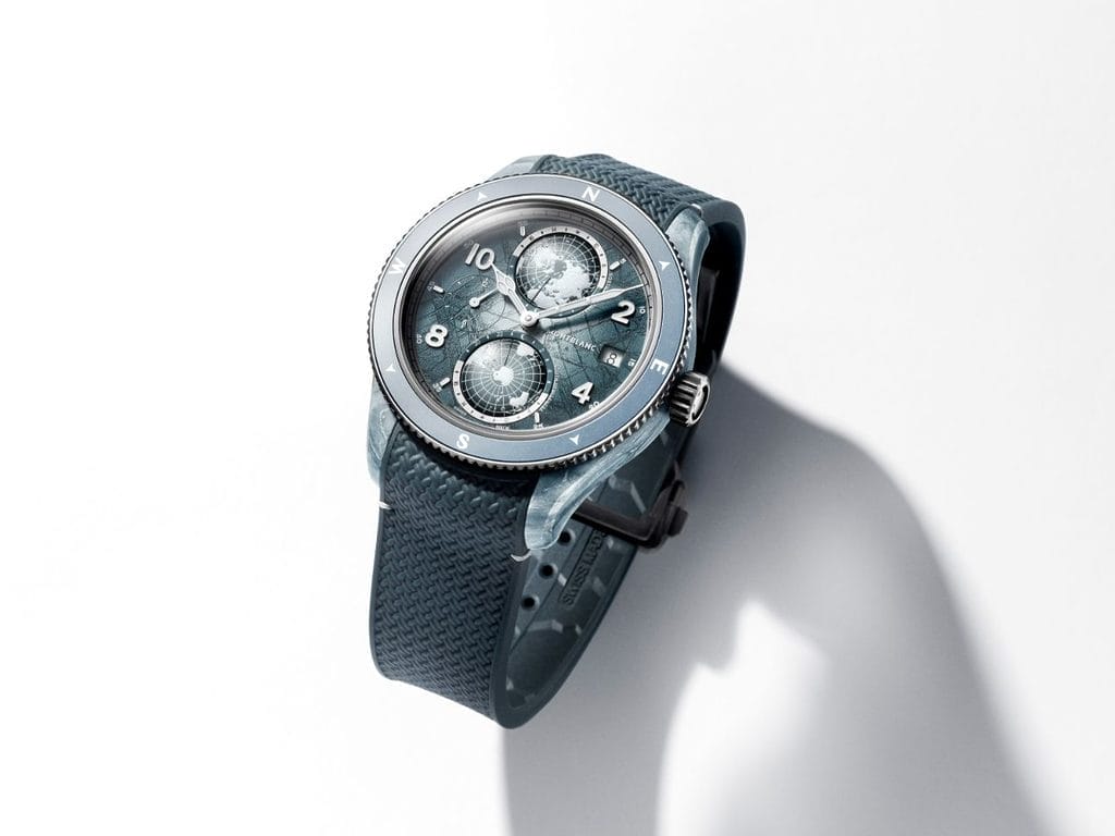 Un clin d’œil discret mais symbolique a été ajouté : les sept sommets du défi de Messner, ainsi que le Mont-Blanc, sont marqués par de petits points sur le globe de l’hémisphère nord. La montre affiche également un deuxième fuseau horaire à neuf heures et une date à trois heures.