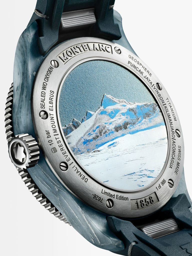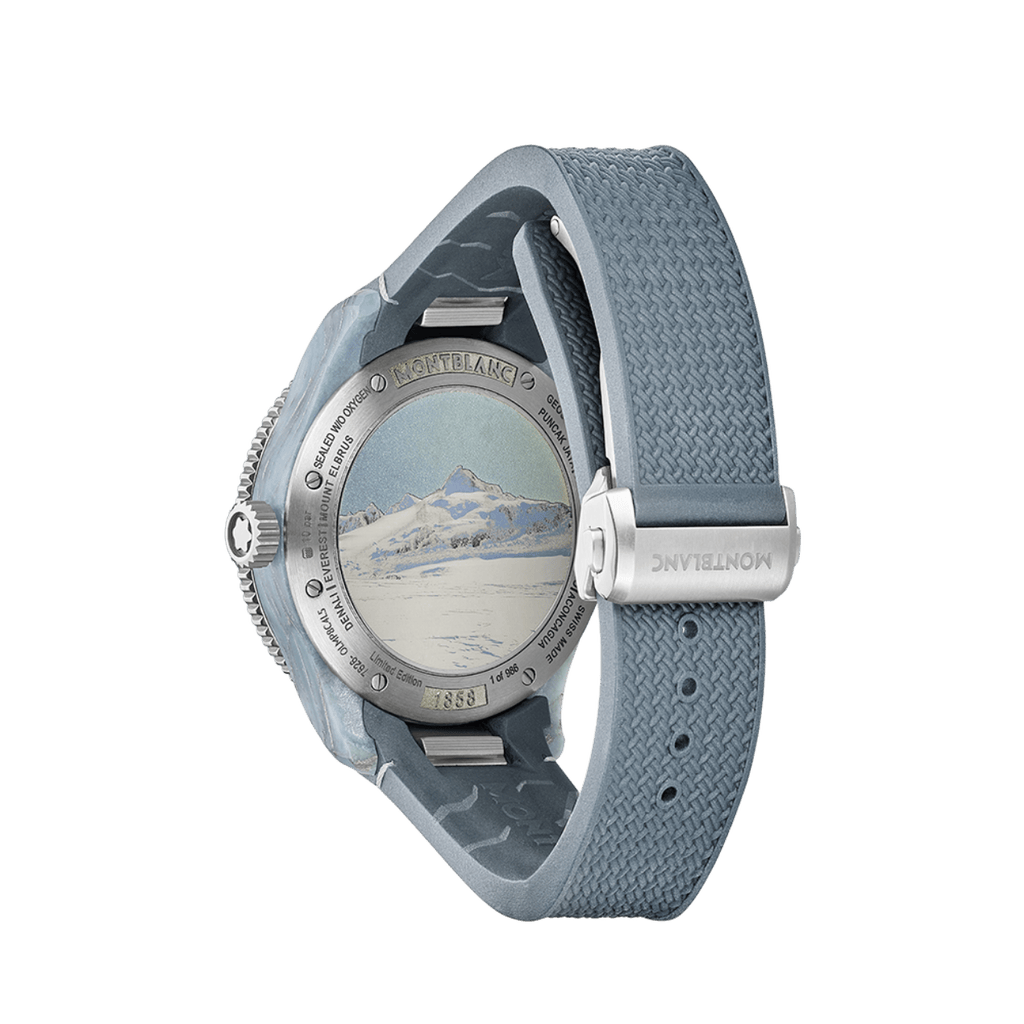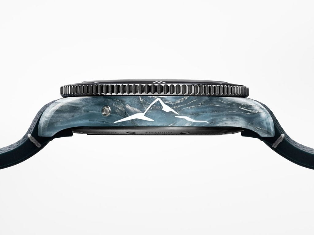 Éditée à seulement 986 exemplaires en hommage à l’année 1986, date de l’ascension du mont Vinson par Messner, cette montre arbore un boîtier en titane de 43,5 mm. Sa carrure inédite est composée d’un matériau innovant associant fibres de quartz, fibres de basalte-aluminium, CaCO3 et résine bleu clair, évoquant les teintes et textures de la glace millénaire. Plus les glaciers sont anciens, moins ils contiennent d’oxygène, ce qui leur donne une couleur bleue intense, un effet parfaitement retranscrit sur cette pièce horlogère.