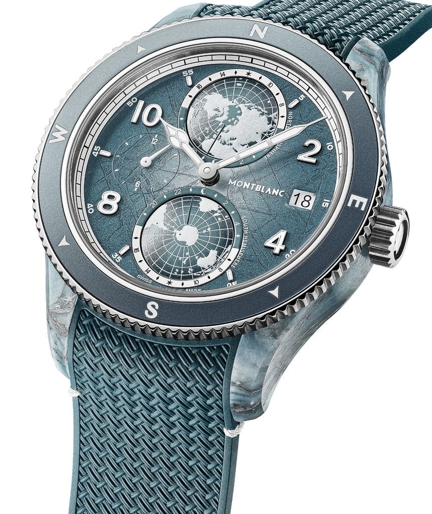 Un clin d’œil discret mais symbolique a été ajouté : les sept sommets du défi de Messner, ainsi que le Mont-Blanc, sont marqués par de petits points sur le globe de l’hémisphère nord. La montre affiche également un deuxième fuseau horaire à neuf heures et une date à trois heures.