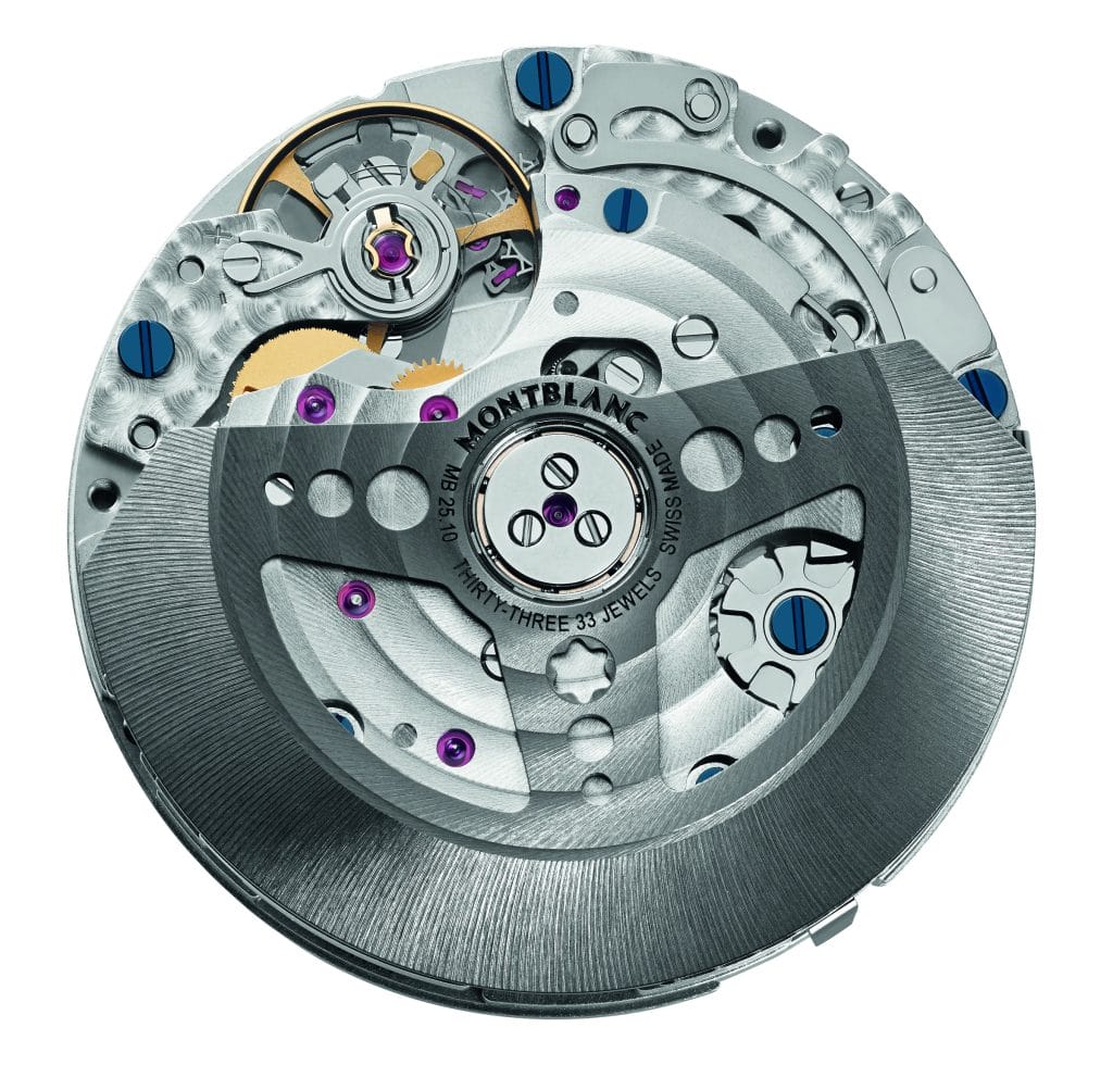La montre est animée par le calibre chronographe manufacture Montblanc MB 25.10 doté de finitions traditionnelles telles que des côtes de Genève, perlage, de vis bleuies et d’une nouvelle masse oscillante monobloc en tungstène rhodié noir en forme de volant. Le mouvement dispose d’une roue à colonnes, d’un embrayage horizontal et d’un mécanisme de stop-seconde qui permet un réglage précis de l’heure.