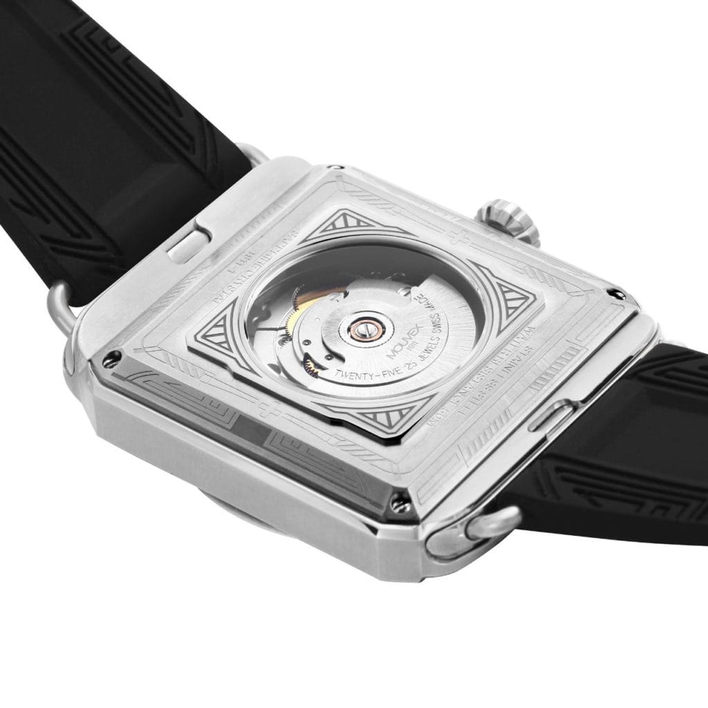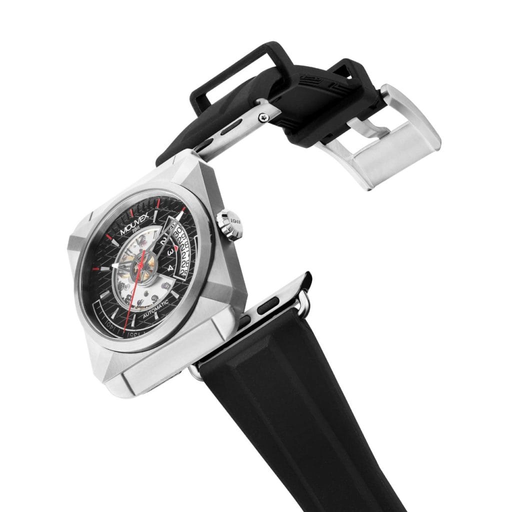 Dans notre échange, Valentin Guidi nous définit chacune de ces valeurs et explicite le tout en présentant le premier modèle de la marque, la Mouvex 1911 Concept Art Déco. Cette montre est voulue différente de la proposition horlogère actuelle dans le segment tarifaire de Mouvex 1911. Sa présence au poignet a été souhaitée et réfléchie. Mieux que cela, les (re)fondateurs de la marque ont souhaité que leurs montres soit parfaitement adoptée par leurs nouveaux propriétaire. Pour ce faire ils ont pensé à un forme d’appropriation que l’on peut rapprocher du phénomène « Open Source » dans l’informatique. Mouvex a un système d’attache de bracelet qui rend la montre compatible avec tous les bracelets pouvant aller sur les Apple Watches. L’idée est excellente quand on sait que les Apple Watches sont les montres les plus vendues dans le monde. De fait, le choix de bracelets pour accessoiriser la montre est quasi infini.