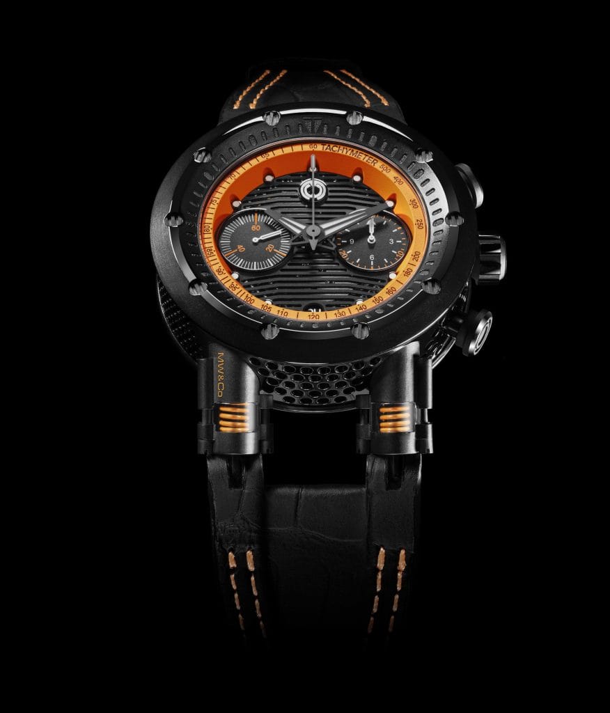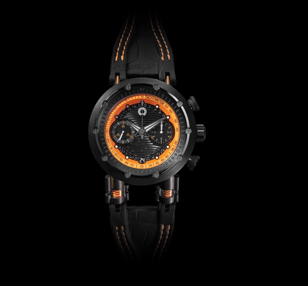 Une autre nouvelle couleur fait son apparition chez MW&Co : le orange. Mécanique, vif, sportif, il se montre subtil sur l’ASSET 2.2 (échelle tachymétrique, gradation de chrono), puissant et éclatant sur l’ASSET 2.3 (rehaut, vérins, gradations de chrono, surpiqure de bracelet). Une même pièce, deux variations pour adhérer à la piste en mode sport ou course, selon les affinités de chacun.