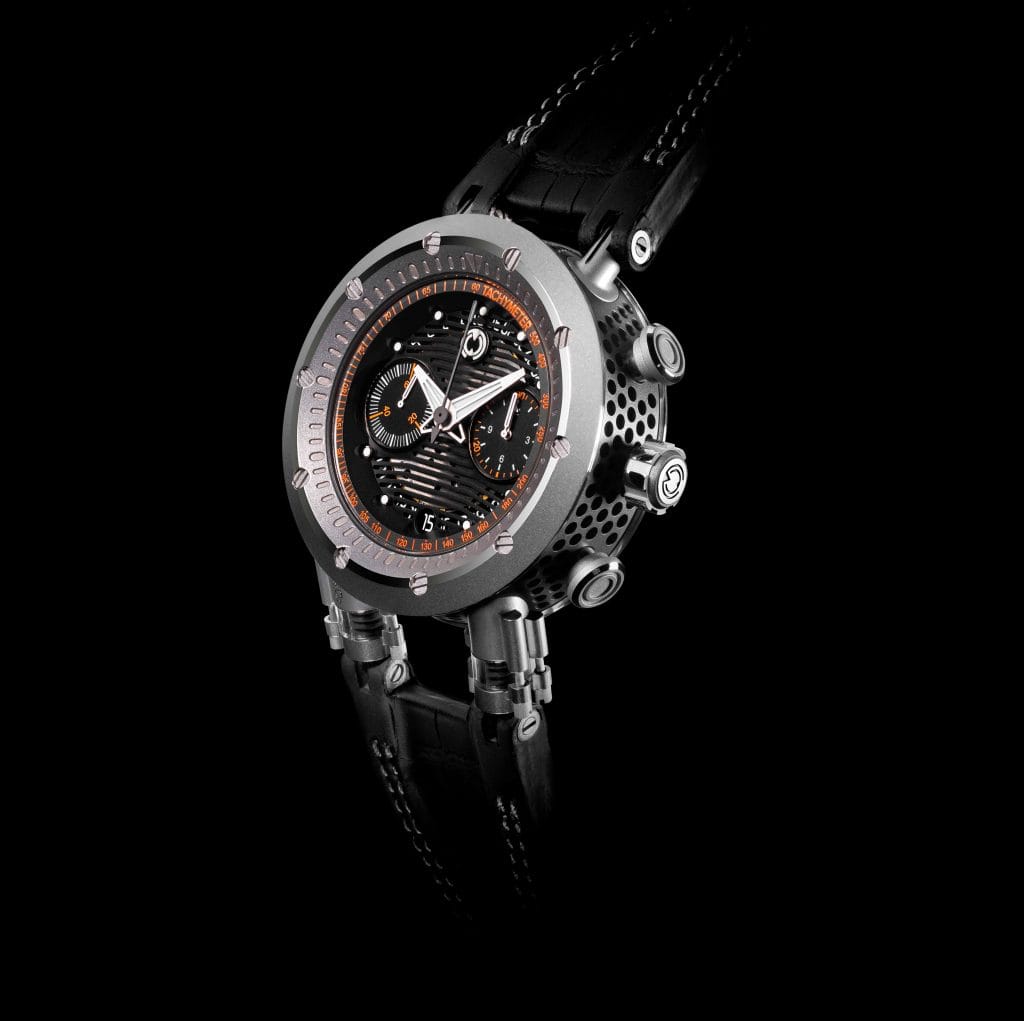 Le titane Grade 5 est utilisé pour la carrure, l’anneau ajouré, la lunette, le fond, le rehaut, la couronne, les poussoirs et cornes, le tout renfermant le précieux calibre 3916A, chronographe automatique à deux roues à colonnes et Flyback.