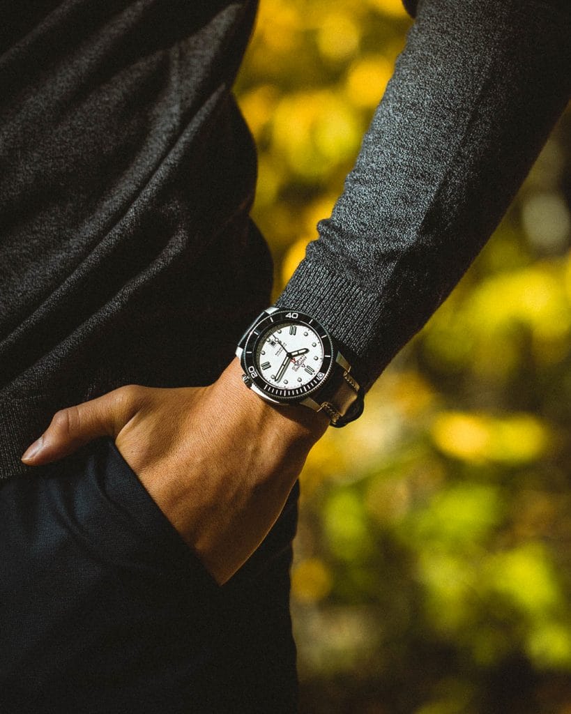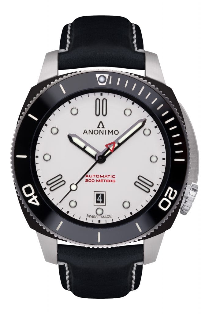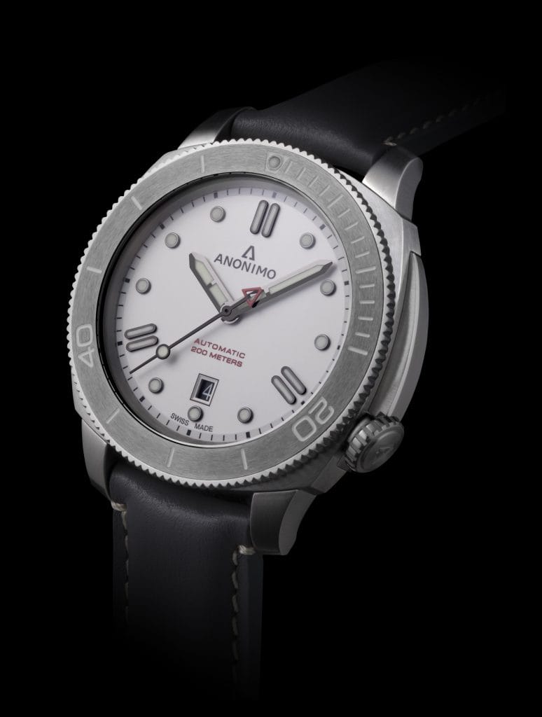 Alors que le travail effectué sur le verre saphir légèrement bombé apporte un sentiment de finesse, la lunette en céramique graduée ajoute profondeur et brillance à l’esthétisme général. Sur le cadran, le marquage luminescent des indexes et des aiguilles ainsi qu’un chemin de fer intérieur permettent une meilleure lecture. Quant aux appliques à midi, 4h00 et 8h00, elles disposent de doubles bâtons et évoque ainsi le A de ANONIMO. Cette disposition en triangle est non seulement une des caractéristiques de la marque, mais assure une parfaite lisibilité de la date logée à 6h00.