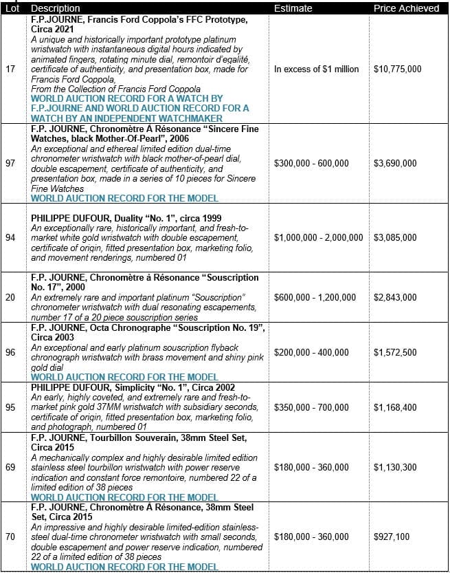 Au-delà du chiffre, cette vacation consacre la montée en puissance des horlogers indépendants, menés par F.P.Journe et Philippe Dufour, et s’illustre par la dispersion d’une sélection de montres issues de la collection personnelle de Francis Ford Coppola, dont la désormais mythique FFC Prototype.
