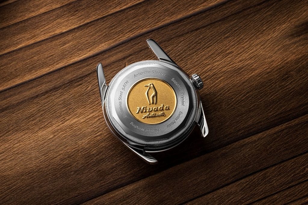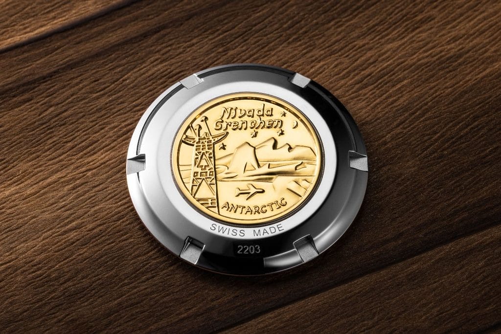 Au dos des versions Regular, le fond de boîte embossé reprend un élément devenu emblématique chez Nivada Grenchen. Un pingouin stylisé sur un médaillon doré, signature de la marque, ou la représentation de la base américaine en Antarctique, selon les versions. Un détail discret, mais chargé de symbolique, rappelant l’origine même de l’Antarctic.