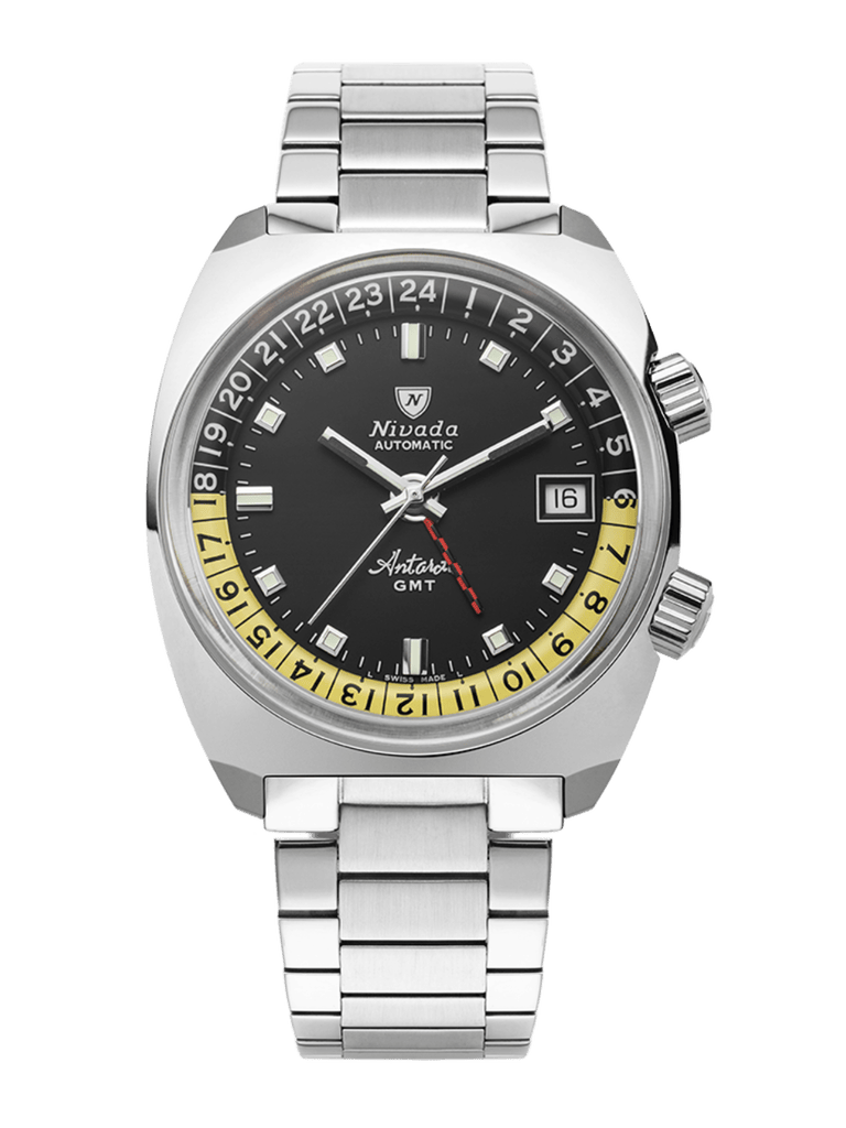 La nouvelle Nivada Grenchen Antarctic GMT revisite l’iconique modèle des années 70, en conservant son caractère rétro tout en l’adaptant aux standards modernes. Ce garde-temps de 36 mm de diamètre et de 11,1 mm d’épaisseur séduit immédiatement par sa présence au poignet, combinant l’esthétique vintage à une taille idéale pour un look élégant et polyvalent. Elle est légère, raffinée et prête à accompagner les voyageurs à travers les fuseaux horaires.