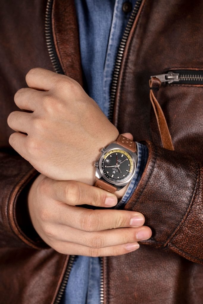 Le cadran noir mat de la montre crée un contraste saisissant avec la lunette 24 heures rotative interne, ornée d’une belle patine ambrée sur la moitié supérieure, accentuant encore le charme vintage de ce modèle. Sous le cadran, on retrouve un mouvement SOPROD GMT de fabrication suisse, assurant une précision moderne et fiable.