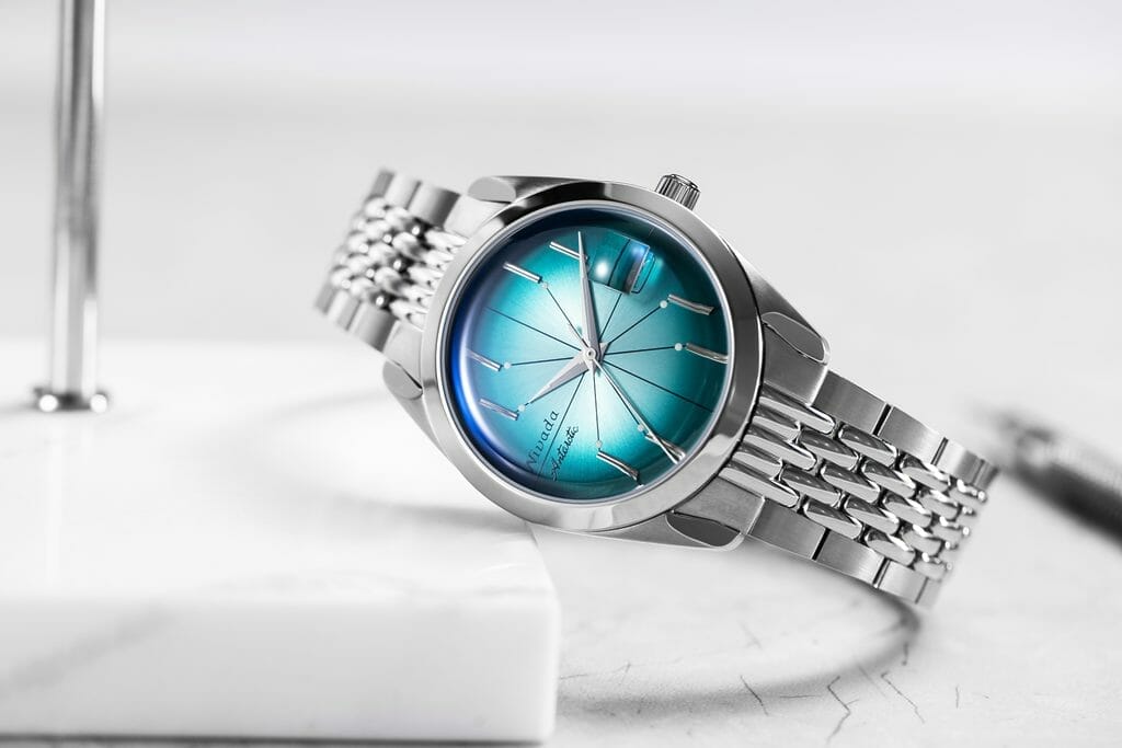 C’est en collaboration avec la boutique parisienne Ocarat que la marque a développé deux versions inédites de sa Spider. L’une avec un cadran bleu Abysse, l’autre bleu Lagon. Deux modèles limités à 25 exemplaires qui abritent un mouvement Soprod P024 à remontage automatique 3 aiguilles.