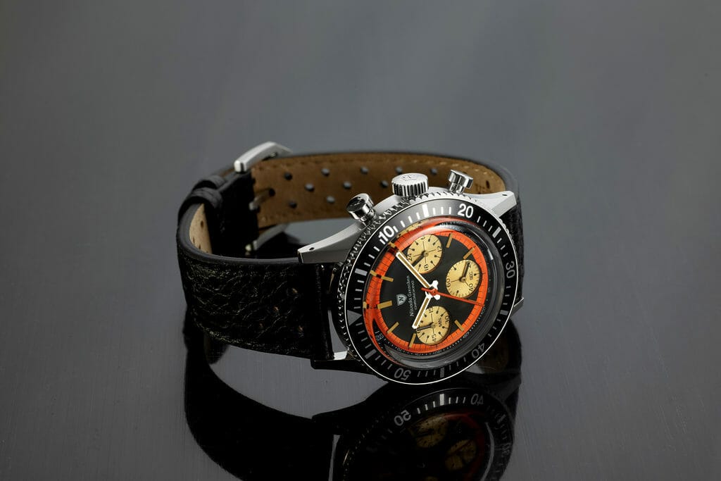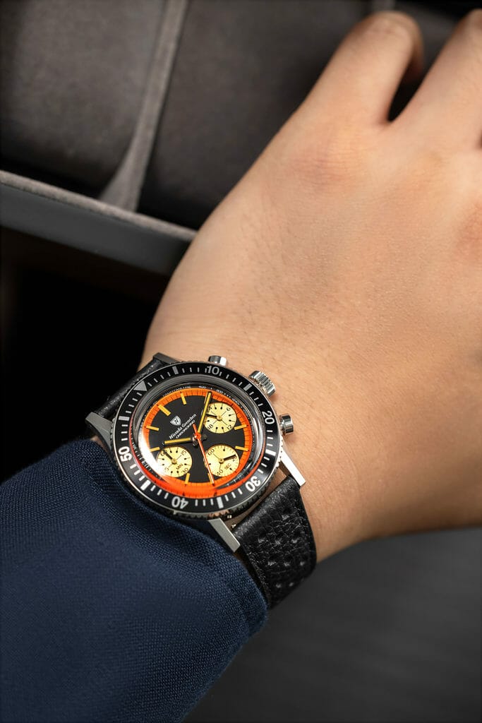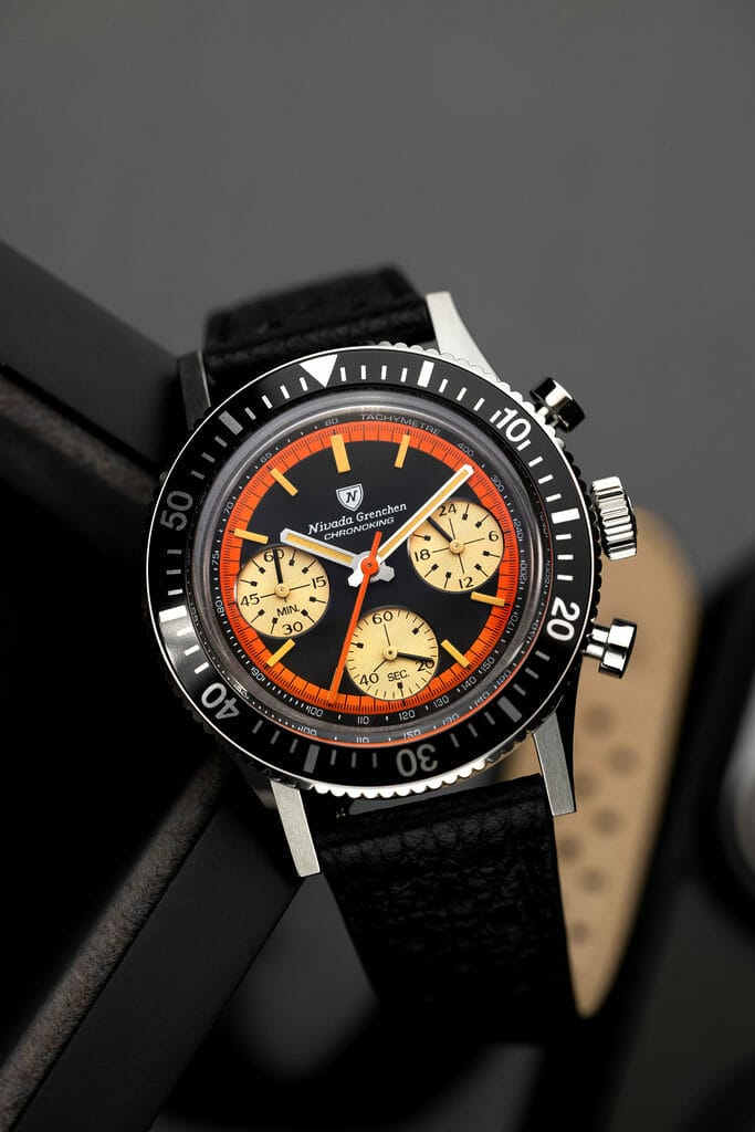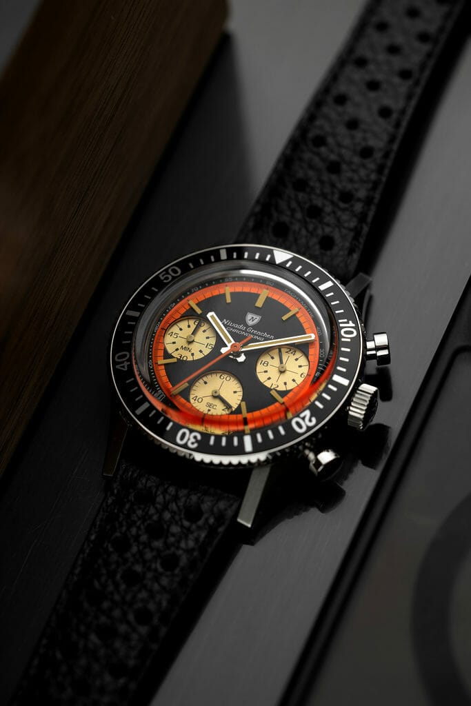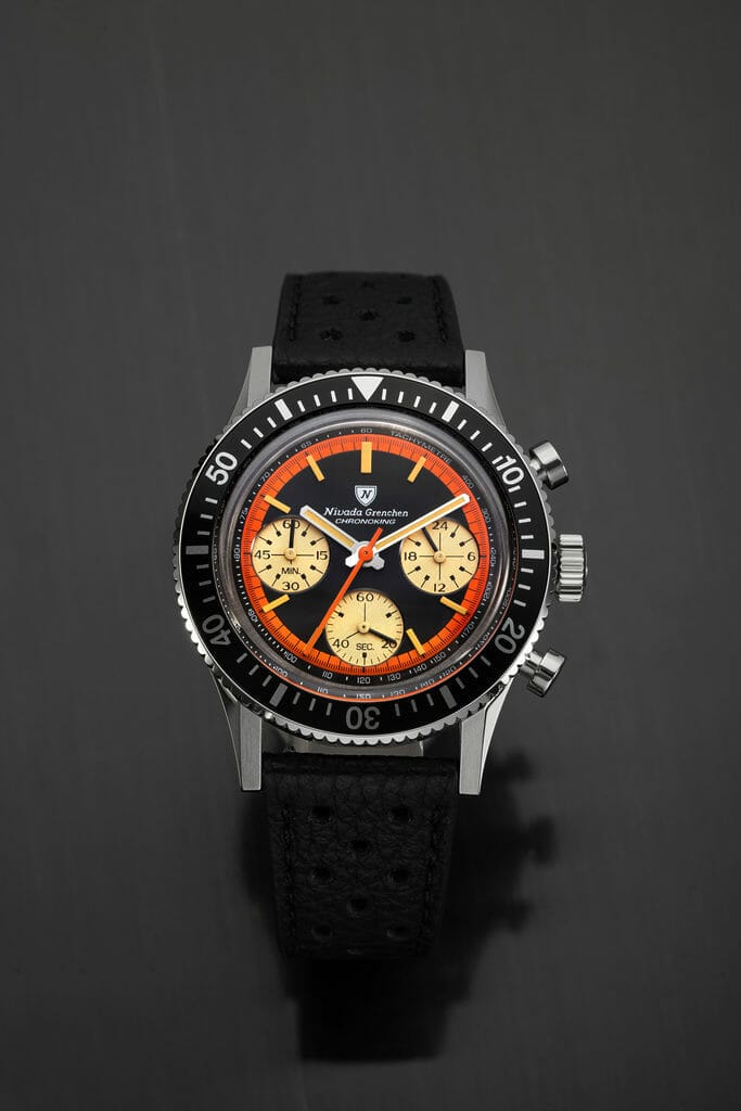 Pour cette réédition, Nivada Grenchen a travaillé sur une nouvelle version de sa Chronomaster inspiré d’un cadran Chronoking vintage tout droit sorti des années 70’s. Il s’agissait à l’origine d’un boîtier tonneau abritant un mouvement Valjoux 72 et des sous-cadrans de style » Paul Newman « .