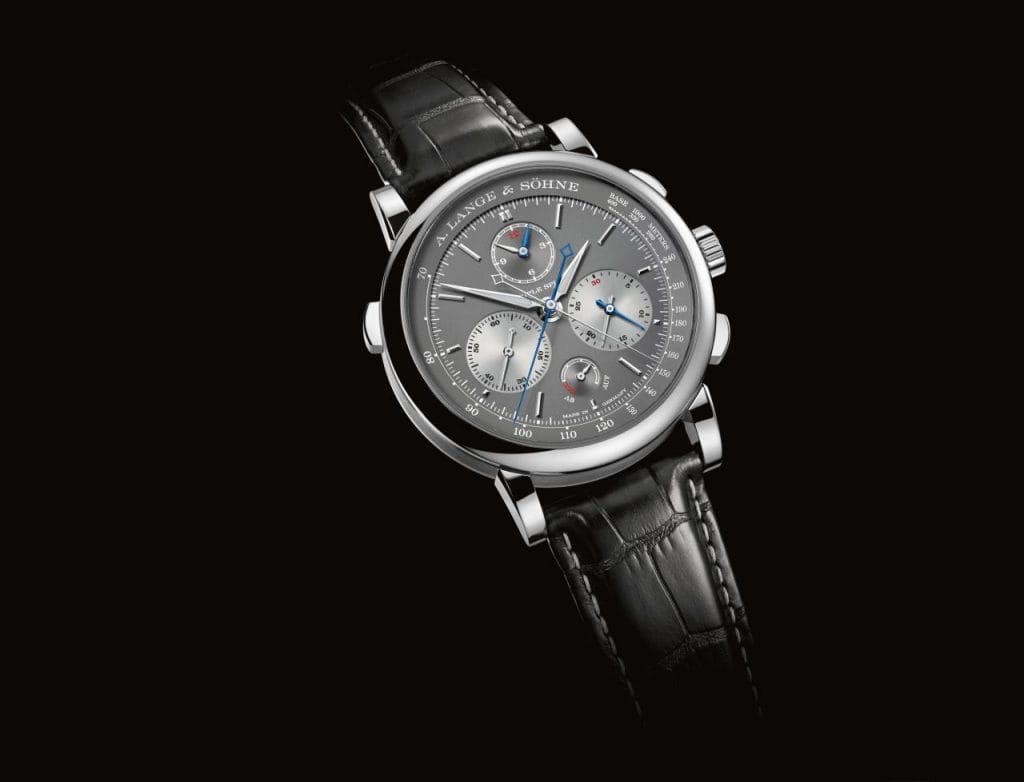 Édité à 100 exemplaires, le Triple Split est en outre doté d’une fonction retour-en-vol pour les trois paires d’aiguilles. Cette fonction permet de réinitialiser le chronographe en cours de mesure et de le redémarrer immédiatement en activant le poussoir inférieur. L’affichage de la réserve de marche, avec la mention « AUF/AB » typique de Lange, indique l’autonomie encore disponible (55 heures maximum). Le cadran gris en argent massif, d’une parfaite lisibilité, et le boîtier en or blanc 18 carats de 43,2 millimètres de diamètre produisent un ensemble chromatique harmonieux. Les trois aiguilles de la rattrapante, en acier bleui, contrastent quant à elles nettement avec celles du chronographe, en acier rhodié. Enfin, les aiguilles indiquant l’heure ainsi que les index bâtons sont en or rhodié. Les aiguilles des heures et des minutes sont par ailleurs luminescentes.