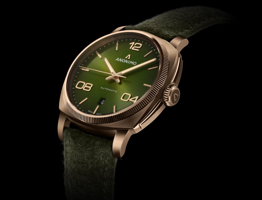 La tendance est au vert, le nouveau noir parait-il, et c’est avec cette couleur qu’ANONIMO dévoile sa nouvelle EPURATO, sobre et épurée. Cette nouvelle ligne, facilement reconnaissable avec les principaux signes identitaires de la marque, propose le mariage du bronze avec le vert dans une version raffinée. A l’approche du printemps, le cadran et son bracelet en feutre déclinent les nuances de la plus nature des couleurs. Le cadran dégradé et soleillé ainsi que le bracelet travaillé main témoignent de la recherche sur la diversité des matériaux et du soin porté à l’esthétisme inspirée de l’élégance italienne.