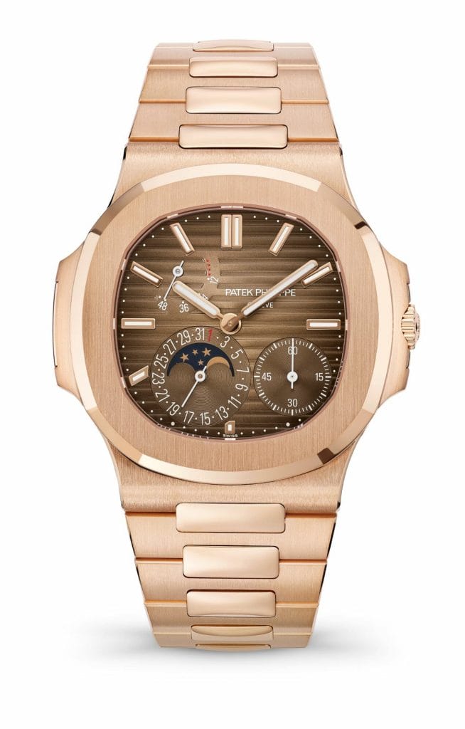La Nautilus avec quantième à aiguille, phases de lune et indicateur de réserve de marche référence 5712/1R-001 (calibre 240 PS IRM C LU extra-plat à remontage automatique) est réinterprétée dans une nouvelle version mariant un boîtier et un bracelet en or rose à un cadran brun « soleil » avec dégradé de noir à la périphérie. Le cadran affiche ses trois complications dans une disposition originale et parfaitement lisible. Le boîtier étanche à 60 m, la lunette octogonale et le confortable bracelet intégré sont rehaussés par un élégant contraste de finitions polies et satinées, effectuées entièrement à la main.
