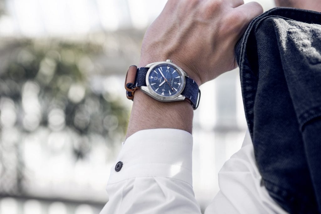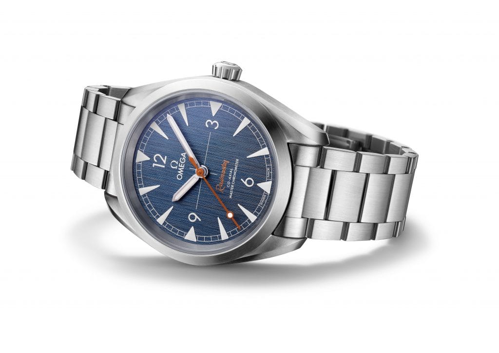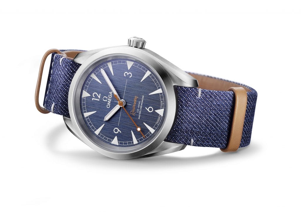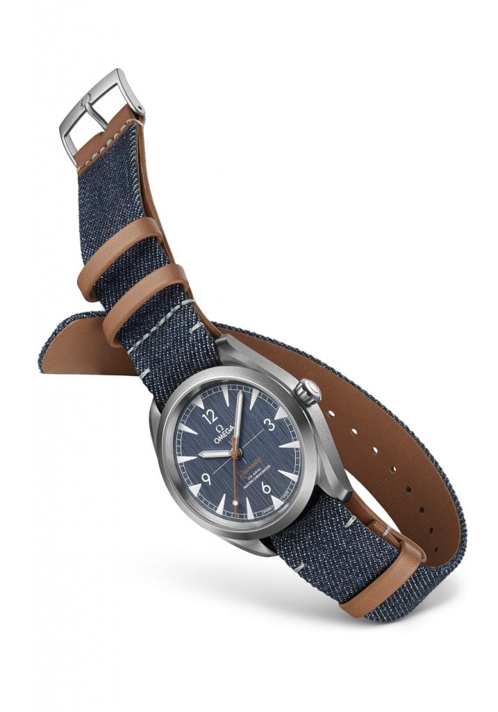 Pour rappeler ce tissu emblématique, OMEGA a créé pour sa nouvelle Railmaster un cadran « blue jeans » brossé vertical arborant des index et des aiguilles revêtus de Super-LumiNova gris clair. L’aiguille centrale des secondes « lollipop » et la mention « Railmaster » décalquée rappellent toutes deux la couleur beige des surpiqûres qui ornent les jeans.