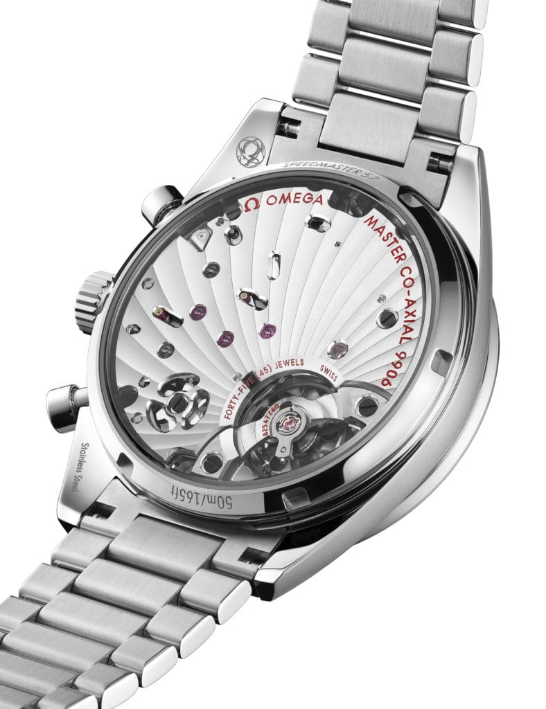 – Fond du boîtier : vissé et poli, gravé des mentions « Speedmaster ’57 » et « 50 m/165 ft » ; verre saphir plat avec traitement anti-reflets sur la face interne