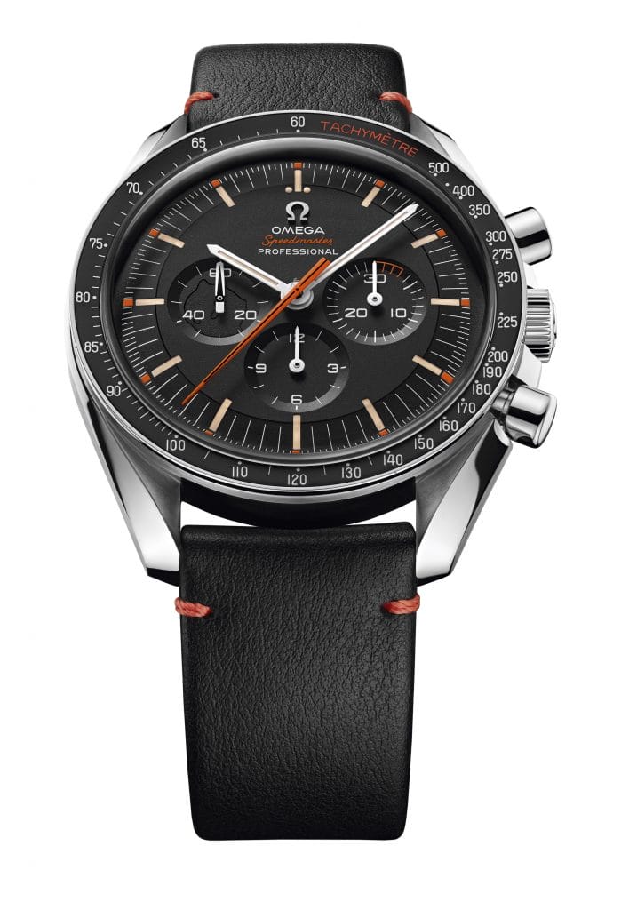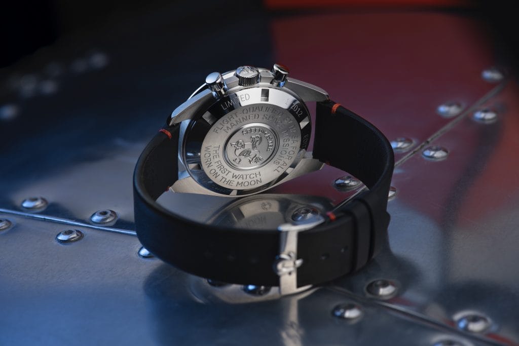 Un logo OMEGA vintage sur le cadran apporte une touche rétro. Sur le fond du boîtier se trouvent gravées les mentions #SpeedyTuesday et « QUALIFIED BY NASA FOR ALL MANNED SPACE MISSIONS ». La montre est présentée sur un bracelet NATO noir et orange et fournie avec un bracelet de rechange en cuir noir.