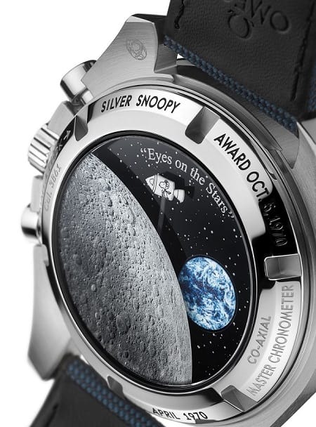 Le système NAIAD LOCK assure que toutes les gravures sur le boîtier, soient alignées par-rapport à la verticale, y compris la date du 5 octobre 1970, date à laquelle OMEGA recevait le Silver Snoopy Award. Il s’agit également d’un hommage à la mission Apollo XIII, en péril cette même année.
