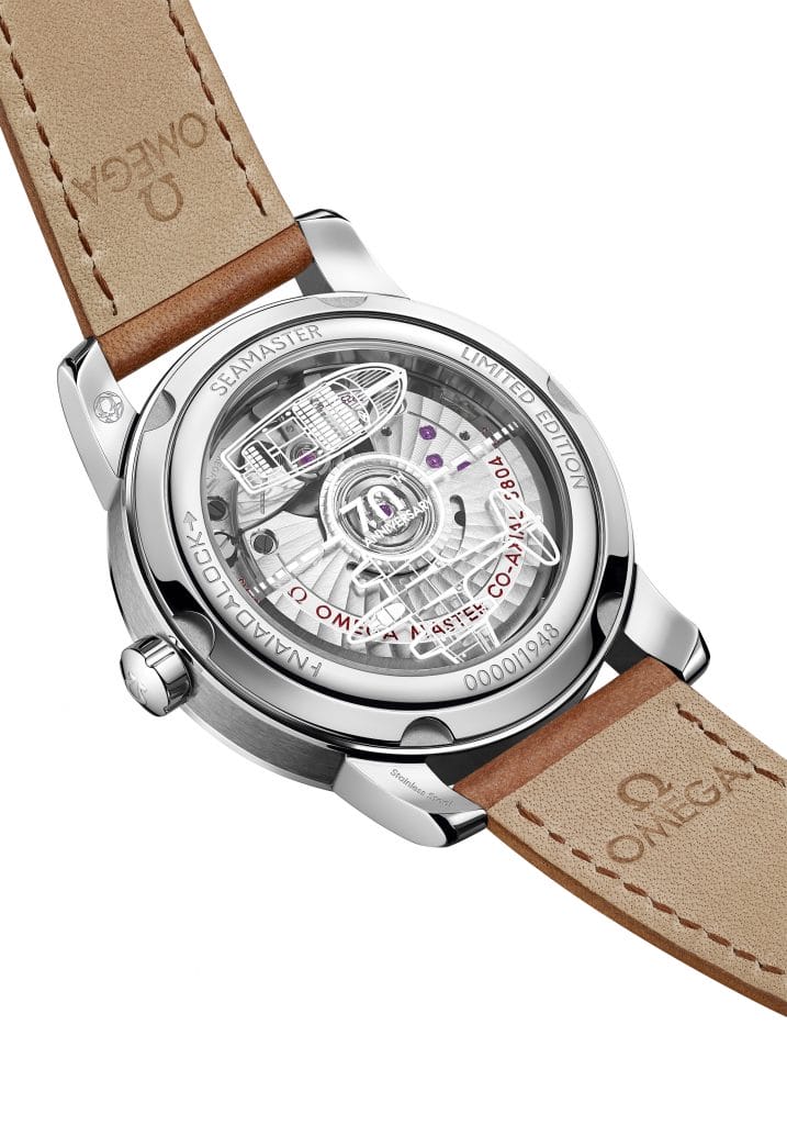 La version Seconde Centrale est équipée d’un bracelet en cuir gris-bleu. Comme sur les modèles d’origine, la boucle des deux versions est frappée du logo OMEGA vintage. Sur le fond, on trouve un verre saphir plat, maintenu en place grâce à la technologie « NAIAD LOCK » brevetée OMEGA. L’anneau qui entoure le verre saphir porte gravé au laser la mention « SEAMASTER LIMITED EDITION » et le numéro de l’édition limitée. Hommage aux nombreux aviateurs et marins qui ont fait confiance aux montres OMEGA, le verre saphir est décoré du logo du 70e anniversaire, gravé et laqué à la main, d’un bateau Chris-Craft et d’un avion Gloster Meteor, le premier avion à réaction utilisé par la Royal Air Force. Les aventuriers du monde moderne pourront compter sur l’intégrité de cette nouvelle Seamaster, étanche jusqu’à 6 bars (60 mètres).